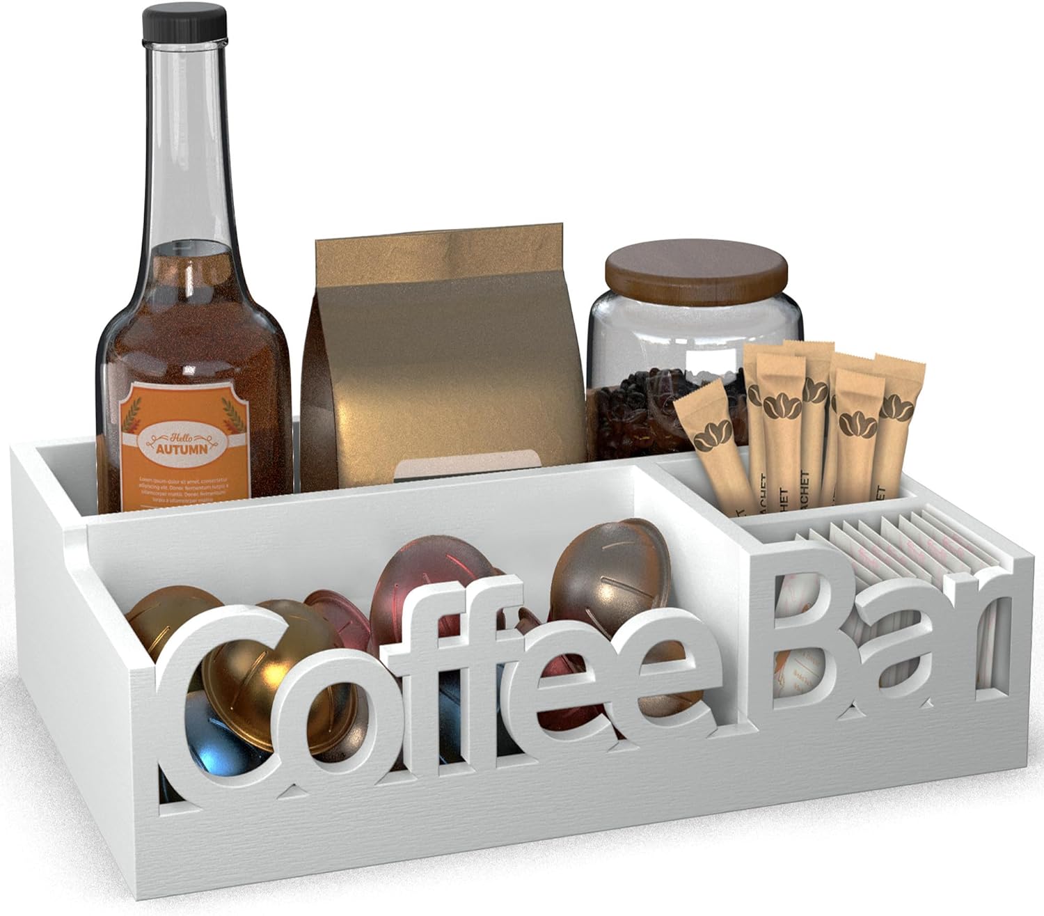 Coffee Bar Organizer for Countertop – Wooden Coffee Station Caddy with Compartments for Pods, Condiments, Tea, and Accessories – Home and Office Mini Coffee Station Organizer (White)