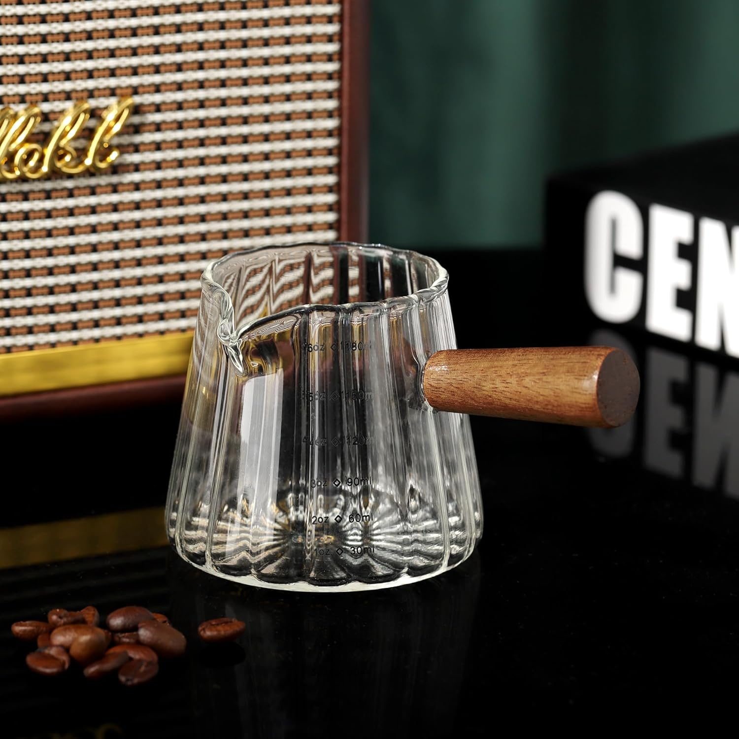Joeyan 6 oz Glass Measuring Cups with Spout,Borosilicate Glass Triple Pitcher with Scale,Origami Style Espresso Shot Glasses with Wood Handle for Coffee Milk,Dishwasher Safe