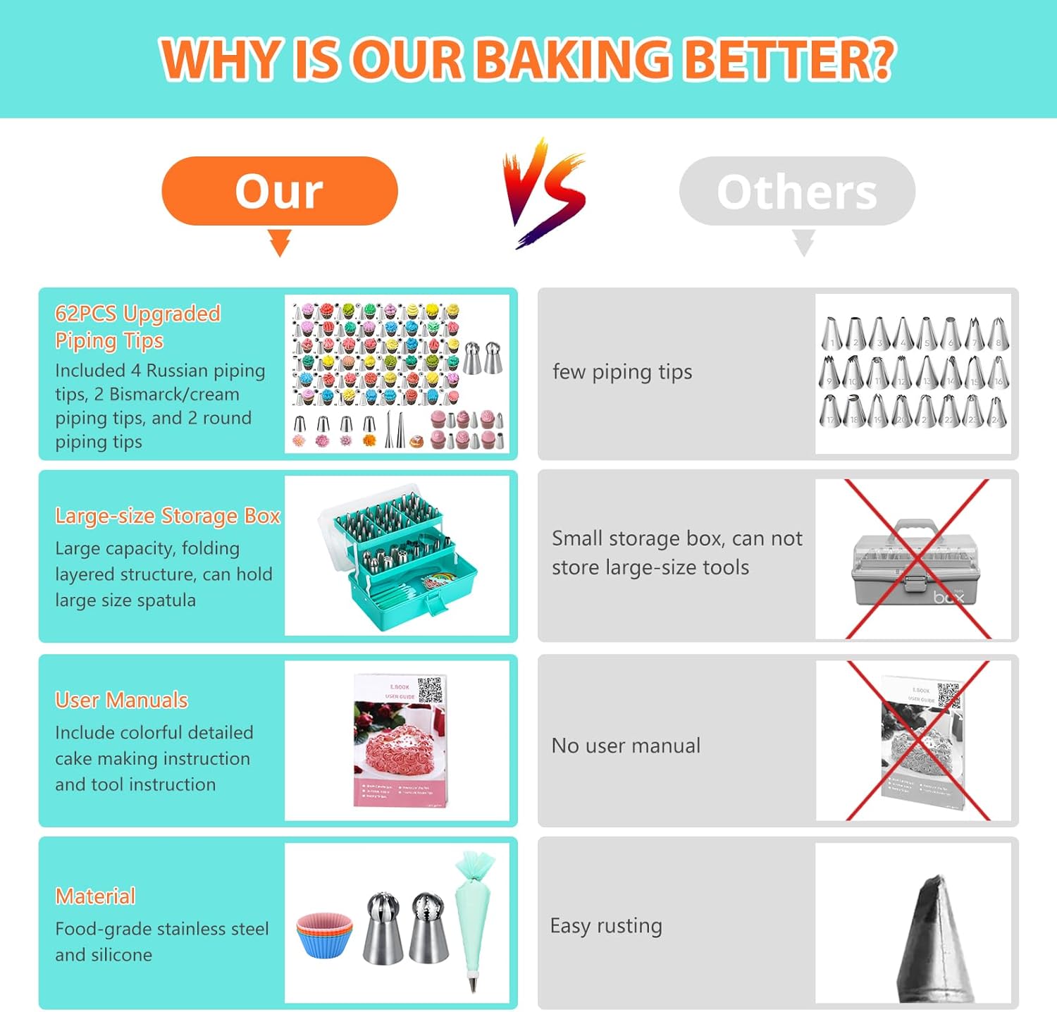 - Package Contents: Layered Storage Box, Spatula, Spatula, 8 Cake Carving Pens, 100 Disposable Piping Bags, Cake Lifter, Triangle Brush, 50 Cake Toppers, Decorating Pens, Egg Separator, 6 Silicone Muffin Cups , 48 Small Piping Tips, 2 Round Piping Tips, 1 Bismarck tip & Puff tip, 6 Medium Tips, 2 Small Converters, 4 Russian Piping Tips, 3-hole Russian converter, 5 Small Measuring Spoons, 2 Small Cake flower nails, 100 muffin cups, 6 cookie cutters, user manual and a book