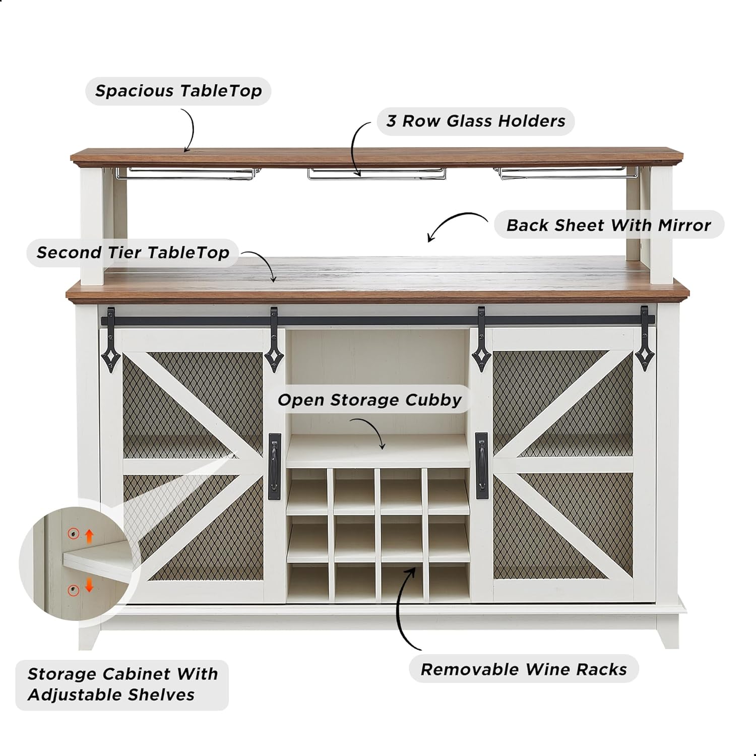OKD Farmhouse Coffee Bar Cabinet with LED Lights, 55" Wine Bar Cabinet w/Sliding Barn Door & Wine and Glass Rack, Kitchen Buffet Cabinet w/Storage Shelves for Dining Room,Antique White