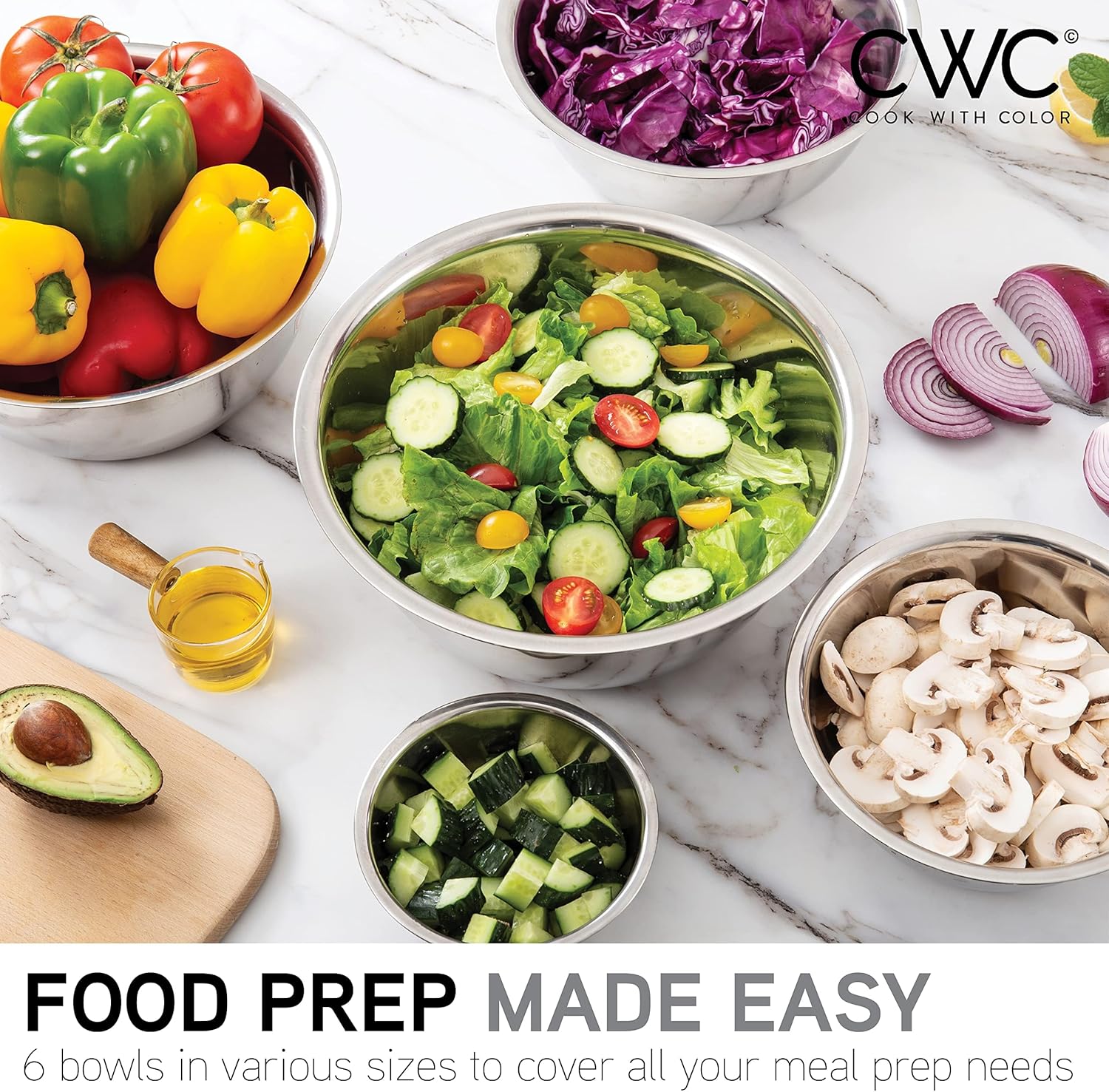 - 6 Piece Stainless Steel Nesting Bowls Set includes 6 Prep Bowl and Mixing Bowls - a practical set of easy to clean kitchen bowls that can be used for food prep, serving and storing.