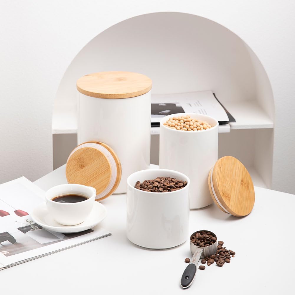 Sweejar Ceramic canisters for kitchen counter,Stackable Food Containers Set with Airtight Seal Bamboo Lid for Serving Ground Coffee, Tea, Spice, Flour and Sugar-Set of 3 (White)