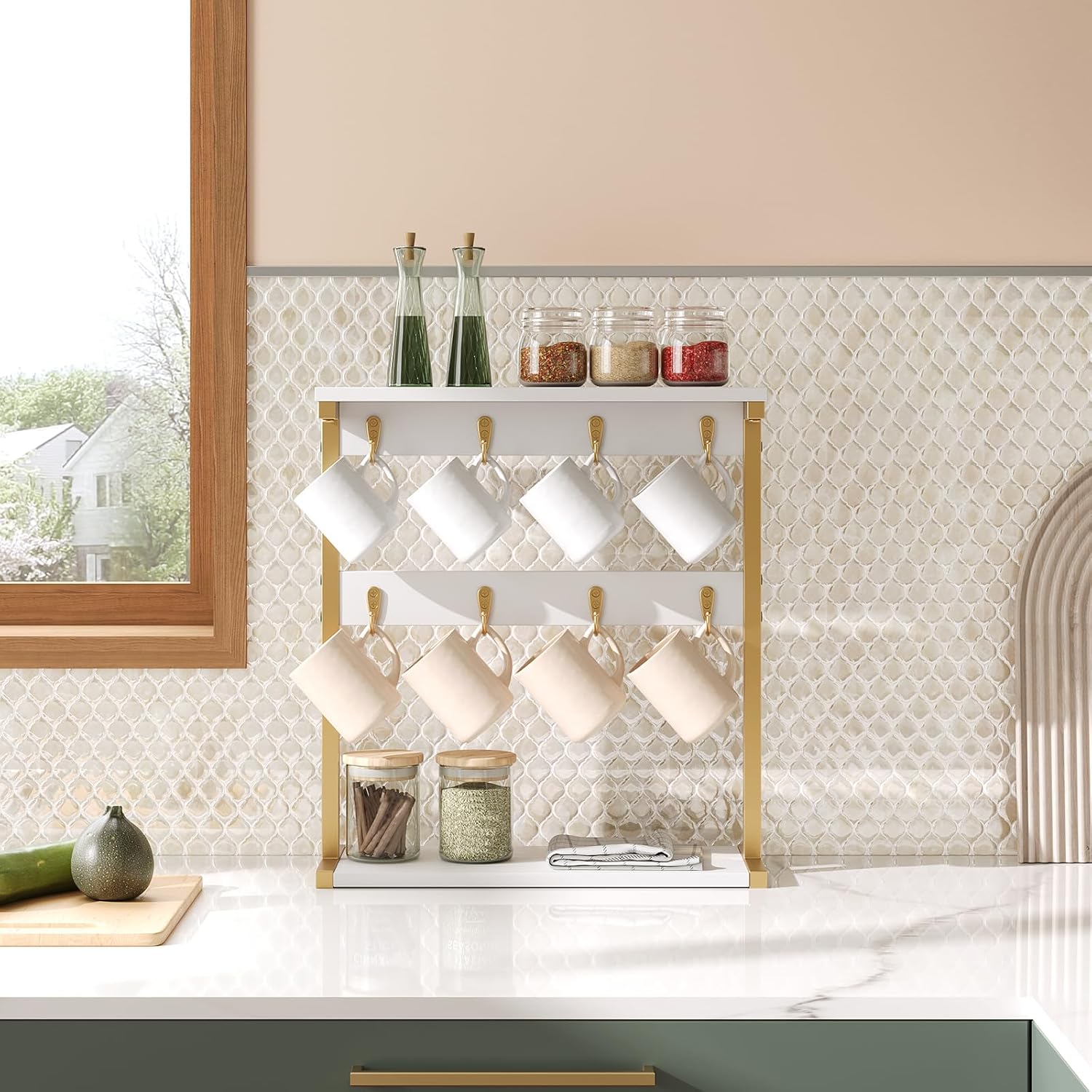 Coffee Mug Holder for Counter, 2 Tier Mug Tree Rack, with 8 Hook and 2 Open Shelves, Vintage Mug Holder Stand for Home Kitchen, White and Gold MH43DW