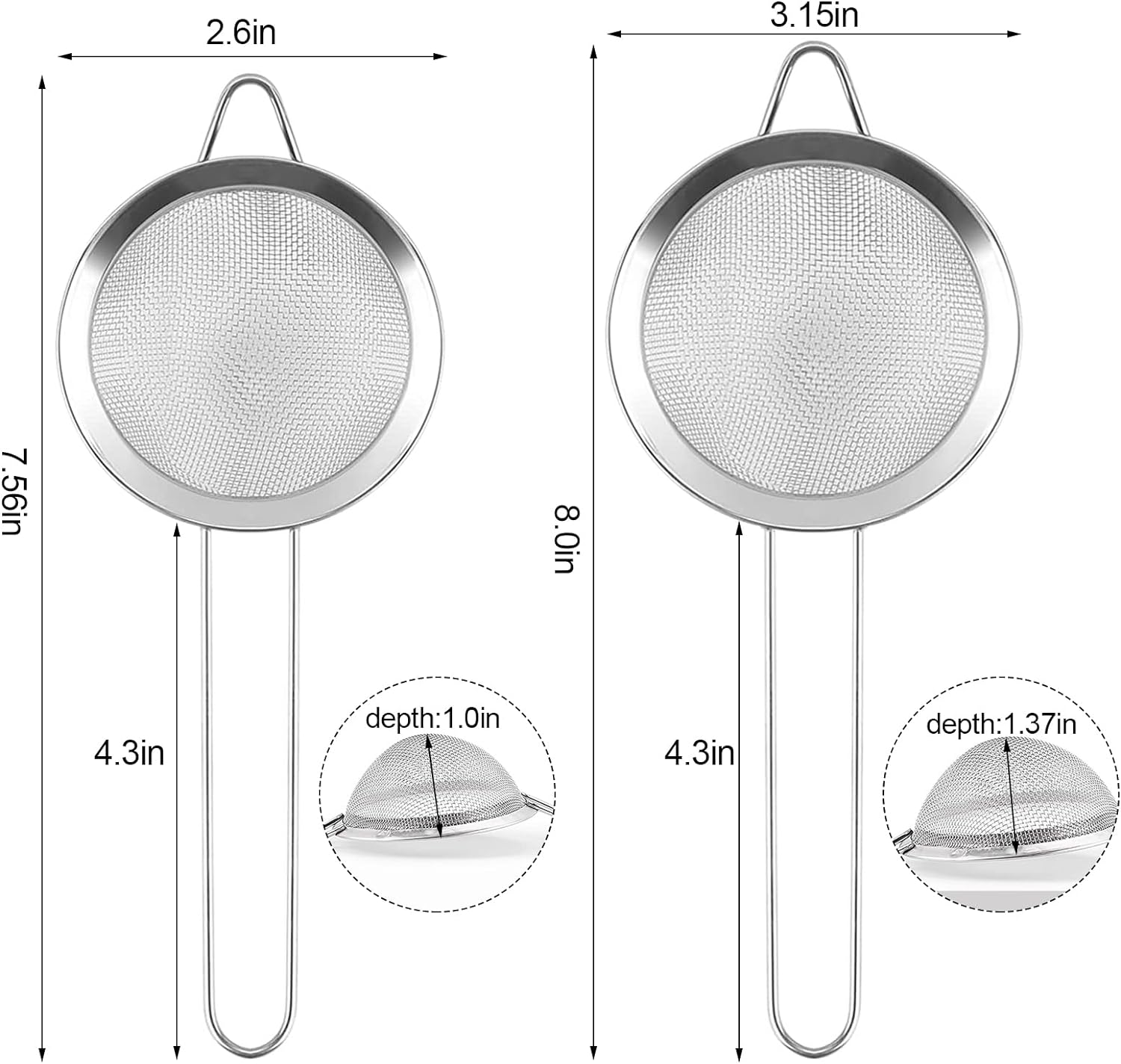 - 🍞Material: Stainless steel strainers are made of high quality stainless steel material. This material is durable and long-lasting, making it an ideal choice for kitchen utensils.