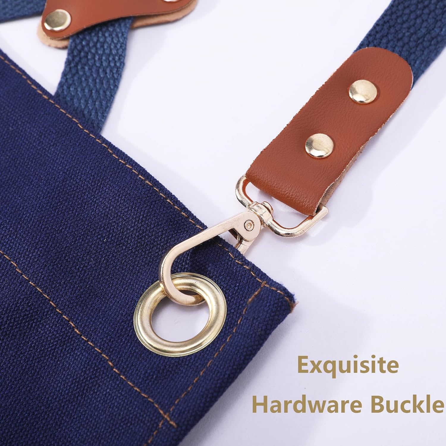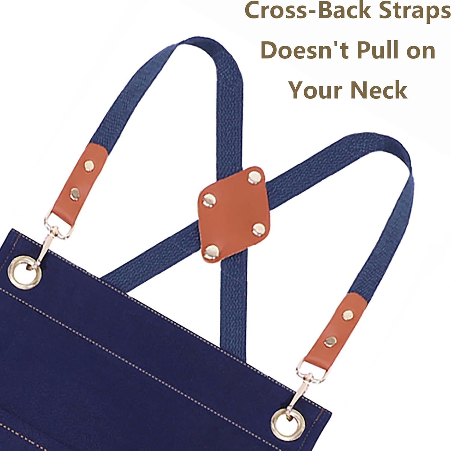 - Comfortable to wear: This kitchen apron has a cross back design that does not pinch your neck. This chef apron is made of high-quality brass metal fasteners and faux leather, and there are leather buckles on the back to fix the two detachable shoulder straps, which is more convenient to put on and take off. The apron is fully handmade and is comfortable to wear for a long time.
