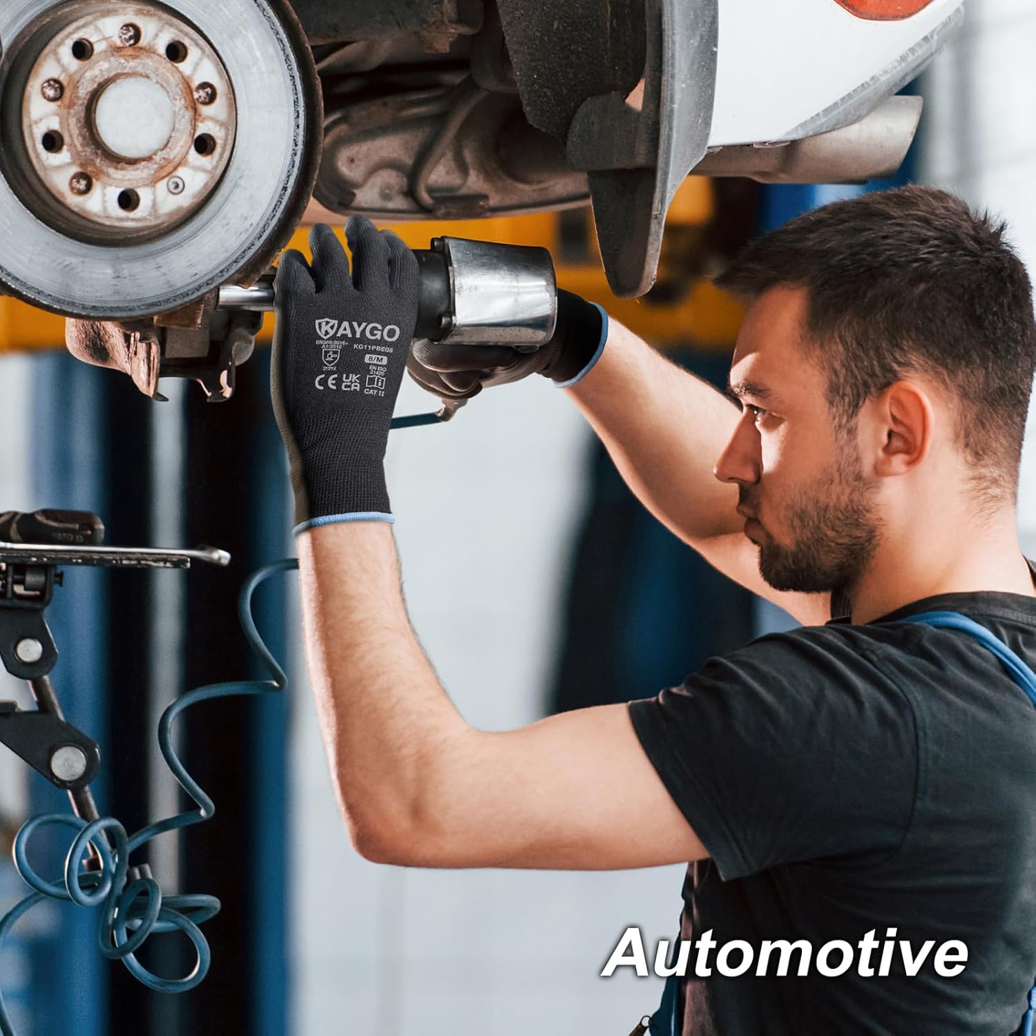 KAYGO Safety Work Gloves PU Coated for Men and Women, 12 Pairs KG11PB, Seamless Knit Glove with Two Fingers Touchscreen, breathable and lightweight Ideal for General Duty Work (XL,Black)