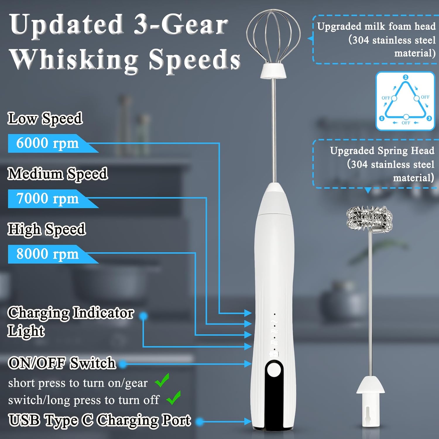 Double Whisk Milk Frother Handheld USB-C Rechargeable Electric Drink Mixer White,3 Speeds Adjustable Coffee Foamer Drink Whisk for Lattes, Matcha, Hot Chocolate, Egg, Matcha