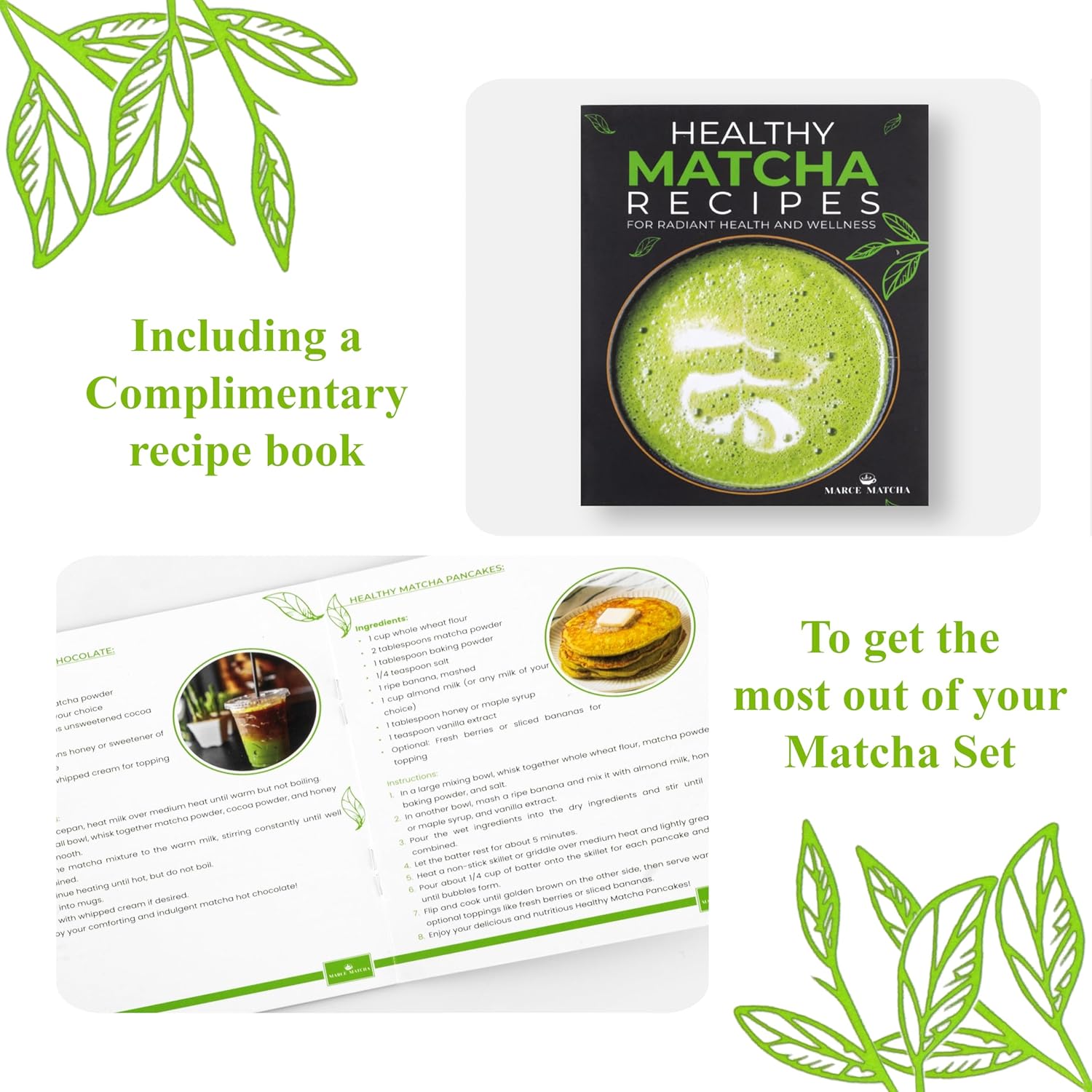 Marce Matcha Whisk Set- Matcha Set includes Matcha Whisk and Bowl (Bowl with Spout), Sifter, Holder and Scoop- The Perfect Bamboo Whisk for Matcha Tea (Molted Green)