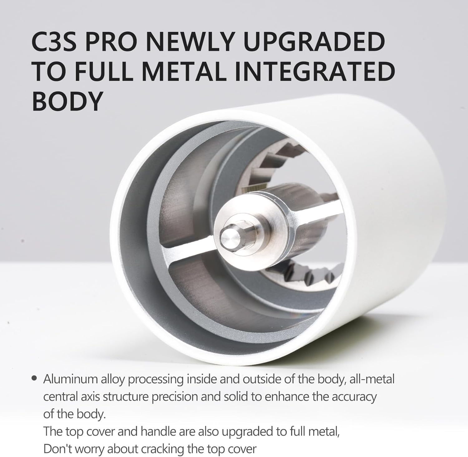 - [ C3 Pro Upgraded to C3S Pro Full Metal Aluminum Body ] Crafted with an all-metal aluminum alloy body, the TIMEMORE C3S Pro manual coffee grinder offers outstanding durability and longevity. This sturdy construction not only withstands frequent use but also protects the internal components from any potential damage. Additionally, the aluminum alloy body contributes to efficient heat dissipation during grinding sessions, preventing overheating that can compromise the delicate flavors of your coffee beans