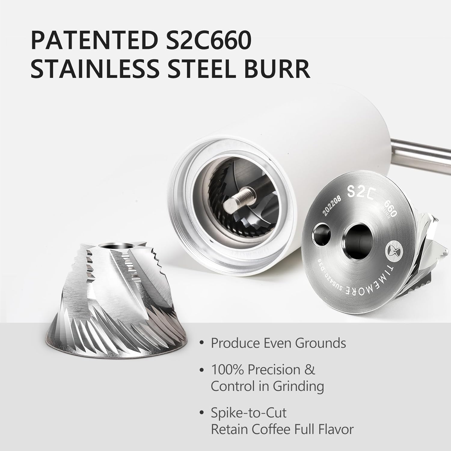 - [ S2C Patent Hexagonal Conical Grinding Burr ] The TIMEMORE Manual Coffee Grinder is equipped with the revolutionary S2C660 patent conical burr. Hand Coffee Grinder Milling blade with 55-58HRC hardness in 5-axis CNC machining realizes uniform grinding with almost no excessively coarse grains. At the same time, the generation of fine powder is minimized. This advanced burr design ensures a consistent and even grind size, allowing for the perfect extraction of flavor from every bean