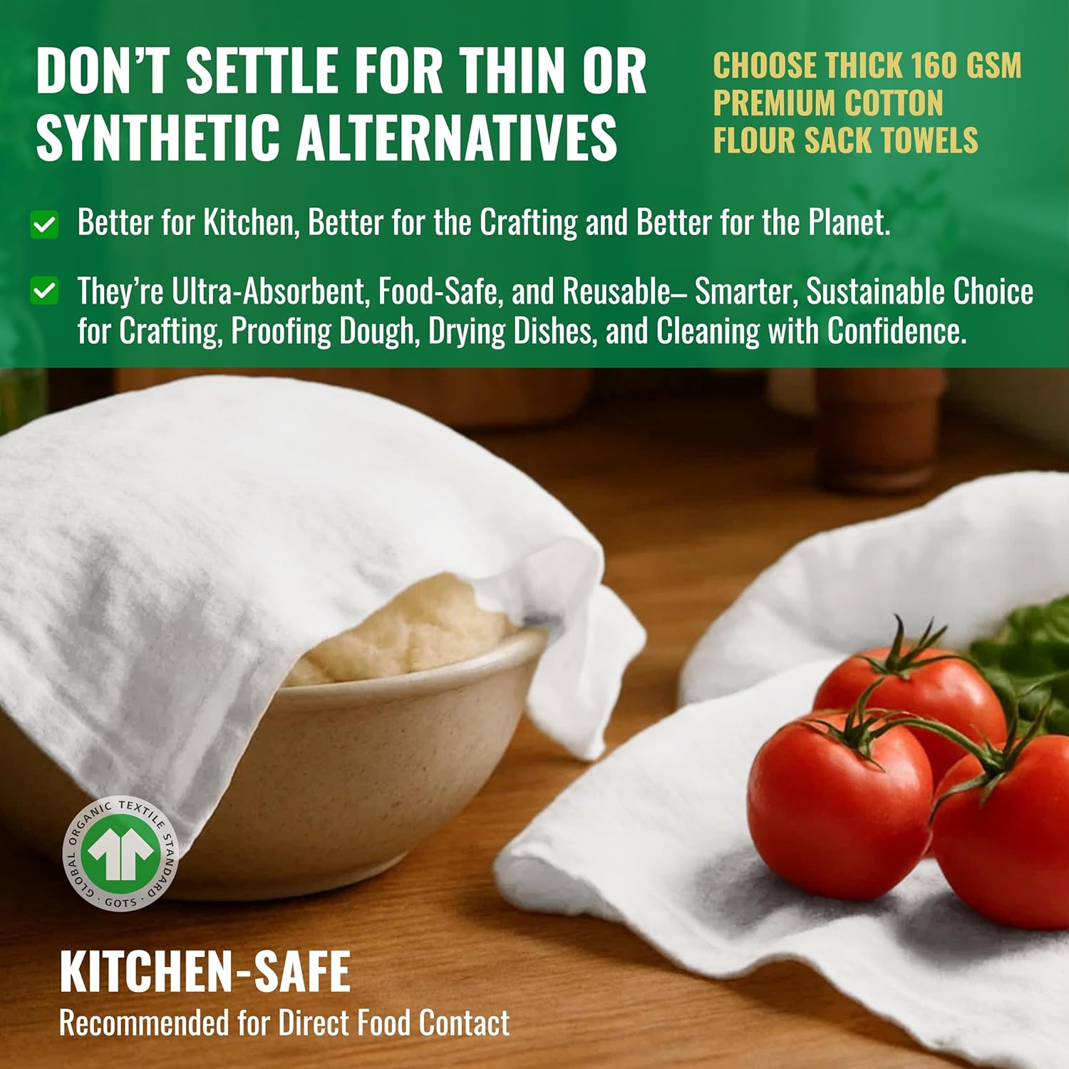 - ✅ Premium 160 GSM Thick Flour Sack Towels – Kitchen-Grade Absorbency Say goodbye to flimsy towels! LITO's ultra-dense 160 GSM 100% ring-spun cotton fabric with a thread count of 130, flour sack towels deliver superior thickness and plush softness—perfect for kitchen drying, wiping, and heavy-duty use.