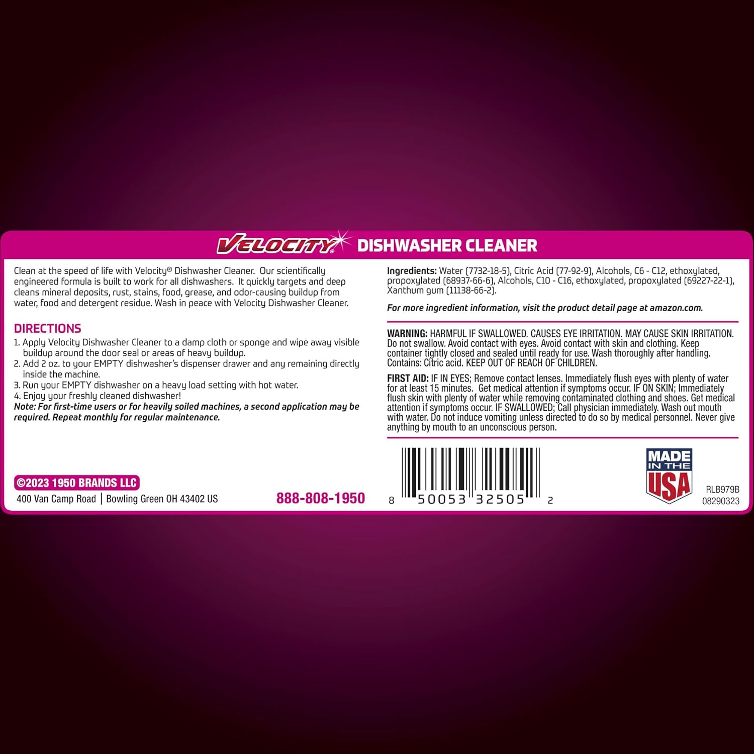 Velocity Dishwasher Cleaner and Deodorizer – 8 Uses Per Bottle. Dishwasher Cleaner and Descaler Deodorizes Interior for Sparkling Dishes, Freshens Machine & Neutralizes Odor