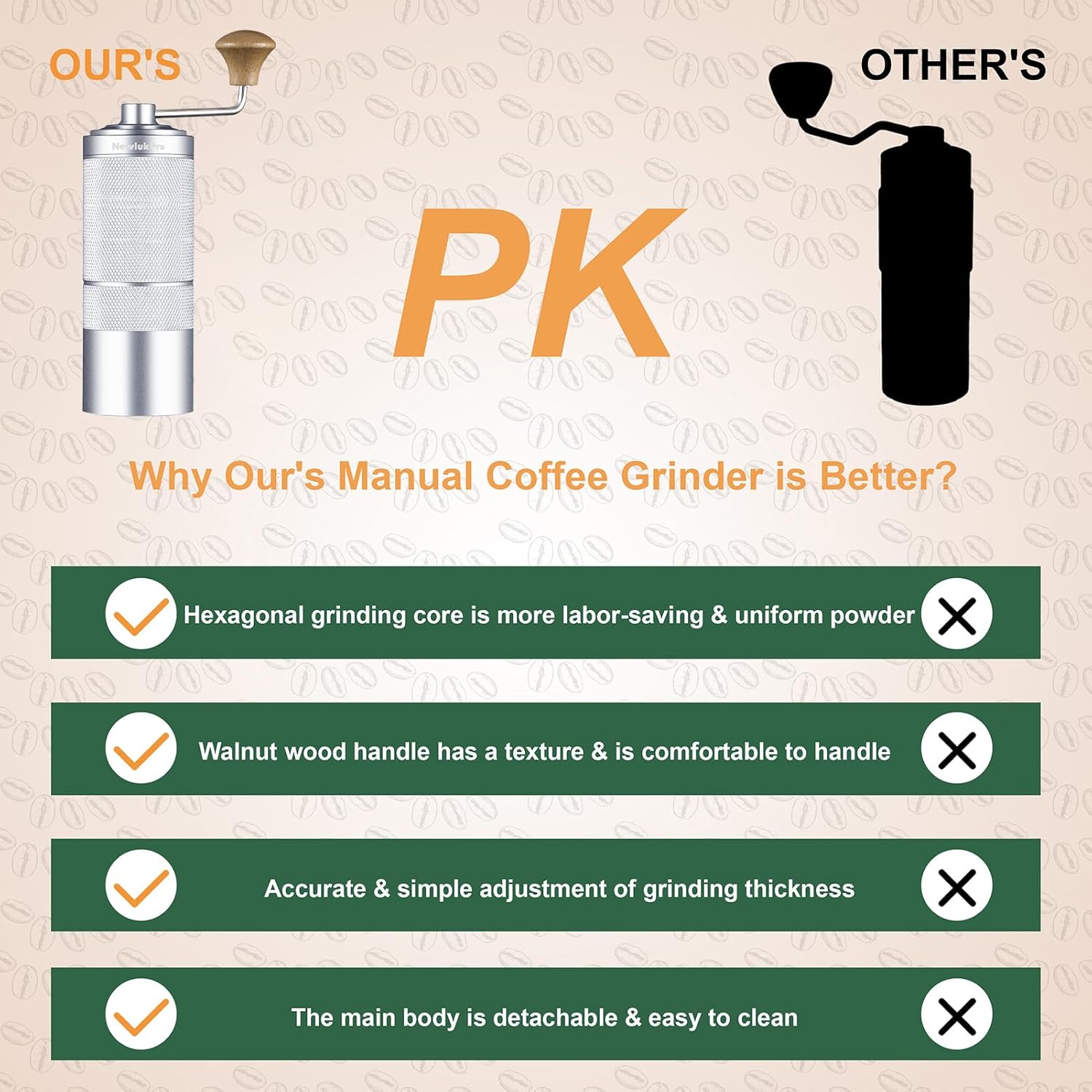 - Beautiful Design for Women : This coffee hand grinder has upgrated sharp SUS 420 hexagonal core & easy to grip anti slip metal body,double bearing axis & comfortable walnut handle.It saves physical strength & outputs evenly coffee powder & has high grind efficiency.What a great helper for female coffee enthusiasts to make Pour Over/Drip,French Press or Espresso!