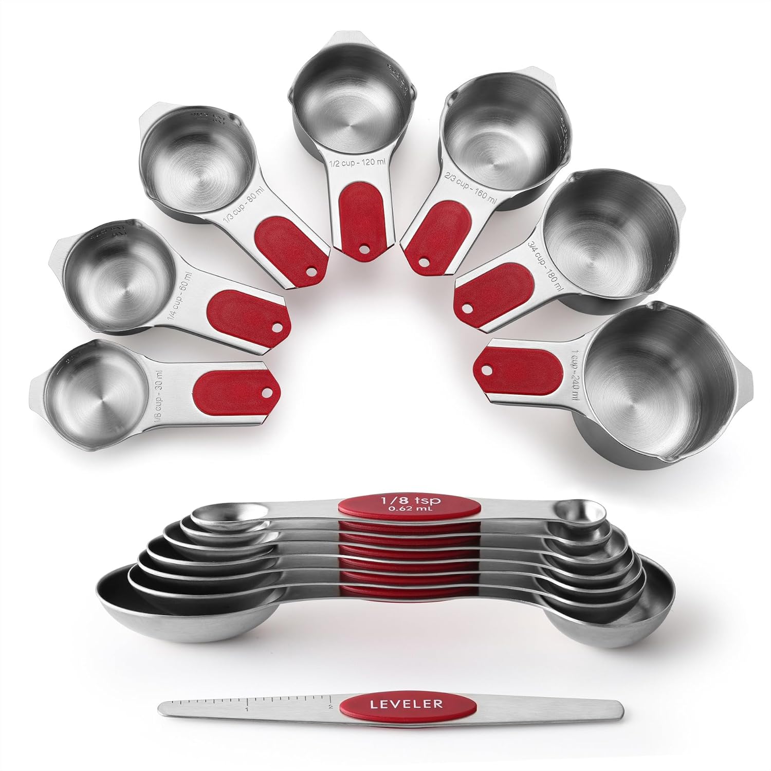 Spring Chef Magnetic Measuring Cups & Spoons Set (Patent Pending), Strong N45 Magnets, Heavy Duty Stainless Steel Fits in Spice Jars for Baking & Cooking, BPA Free, Round Set of 15 with Leveler, Red