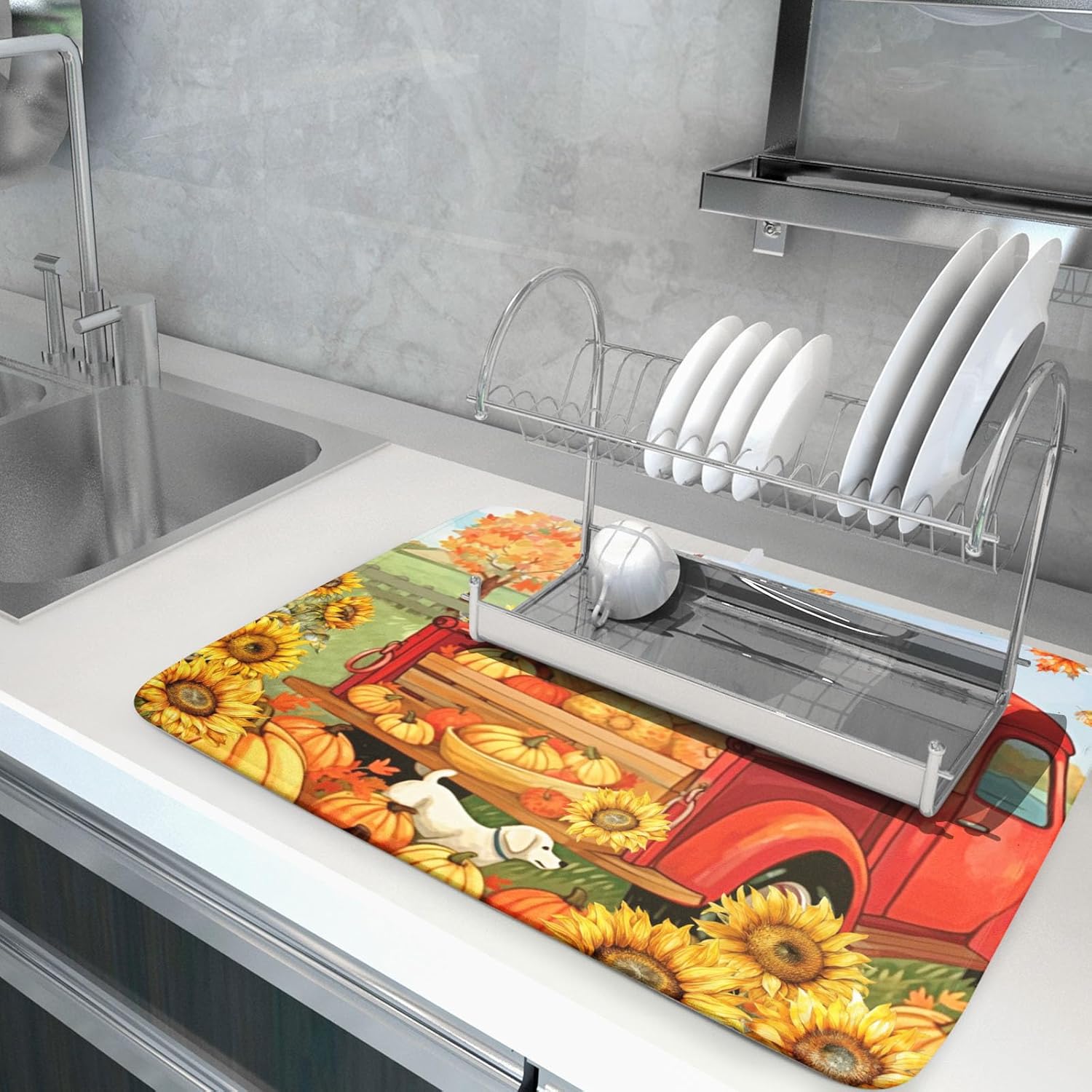 - 2【Widely Used】: The fall harvest red truck drying mat for kitchen counter, coffee bar, dish drain rack, great for air drying dishes, glasses, silverware, pots, pans, fruits and vegetables. It's fade resistant and never stain your kitchen counter topand keep your counter dry.