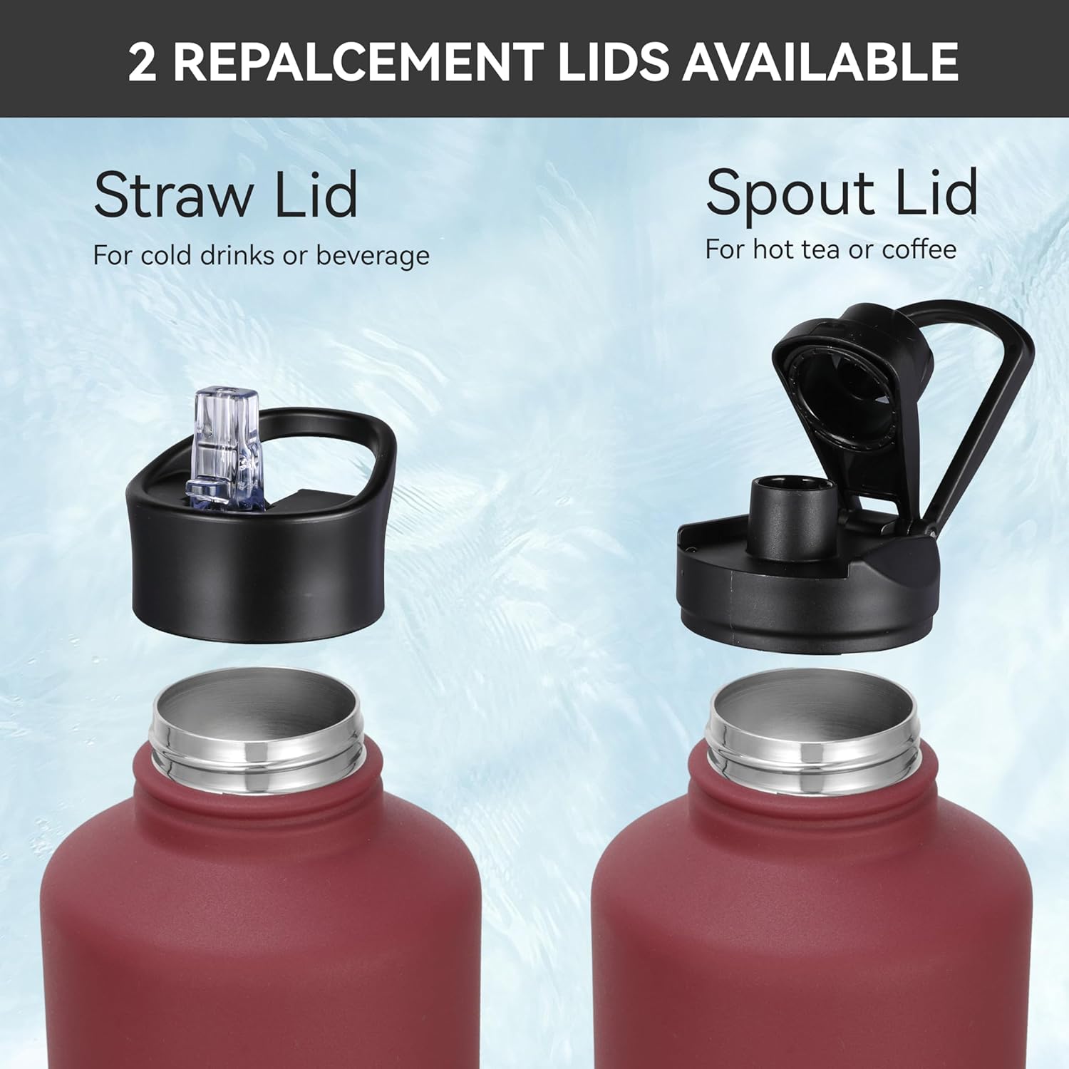- 【SPOUT LID & STRAW LID】This 64 oz stainless steel water bottle comes with spout lid and straw lid, two different lids are complete LEAK PROOF & design for easy drink. Use the one with the mouthpiece for hot drinks, and the one with the straw for cold beverages. Wide mouth design allows for hassle-free bottle cleaning and ice adding.