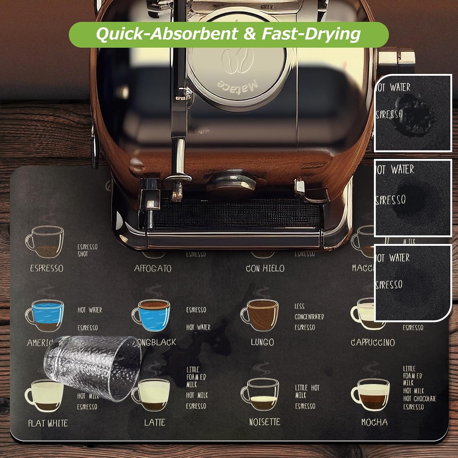 Matace Designer Coffee Bar Mat, Large 16 x 24 Inches, Rubber Backing, Absorbent Dish Drying Mat for Kitchen Countertop, Heat Resistant, Black