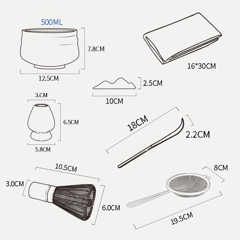 - 𝐓𝐡𝐞 𝐏𝐞𝐫𝐟𝐞𝐜𝐭 𝐉𝐚𝐩𝐚𝐧𝐞𝐬𝐞 𝐌𝐚𝐭𝐜𝐡𝐚 𝐓𝐞𝐚 𝐒𝐞𝐭 :Embrace the essence of Japanese matcha experience with the perfect 7-piece matcha starter set.Contain:1*Ceramic Matcha Bowl 500 ml/17 oz, 1* Cermaic Whisk Stand(Chasen Holder), 1* Ceramic Scoop Stand, 1* Bamboo Whisk, 1* Bamboo Scoop (Chashaku),1* Cotton Tea Cloth, 1* Matcha Powder Sifter. Whether you're a matcha enthusiast or seeking to delve into the traditions of Japanese tea ceremony, this set caters to all your needs