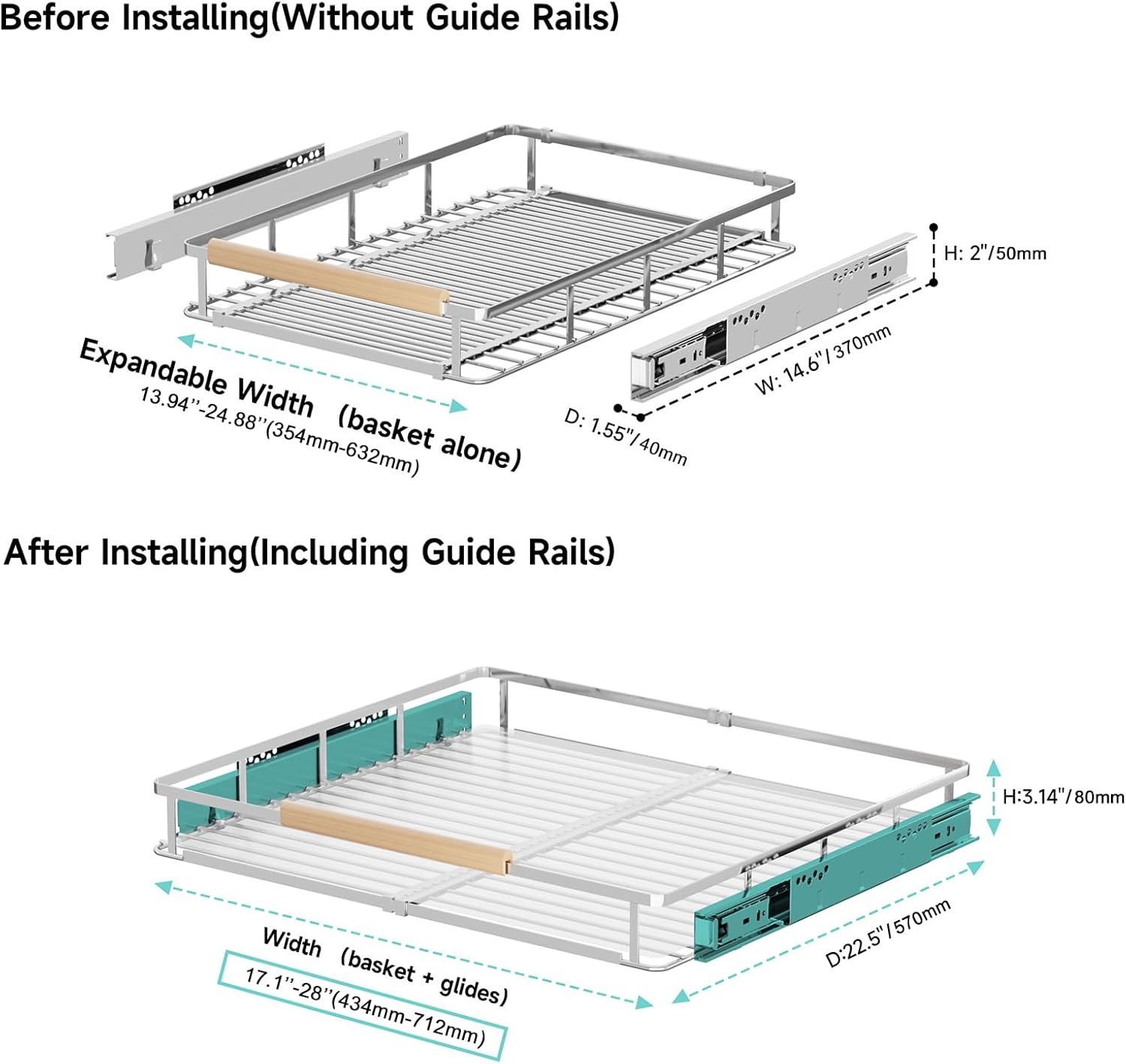 - Expandable Width: This jkxoo Expandable pull out cabinet shelf is designed to fit in most cabinets. The width of the heavy duty slide out storage shelf can be adjusted from 17.1’’ to 28’’ and 22.5" in depth. The new expandable design gives you a better experience and saves your space. It can better utilize and save more cabinet space than ordinary pull out cabinet organizers.