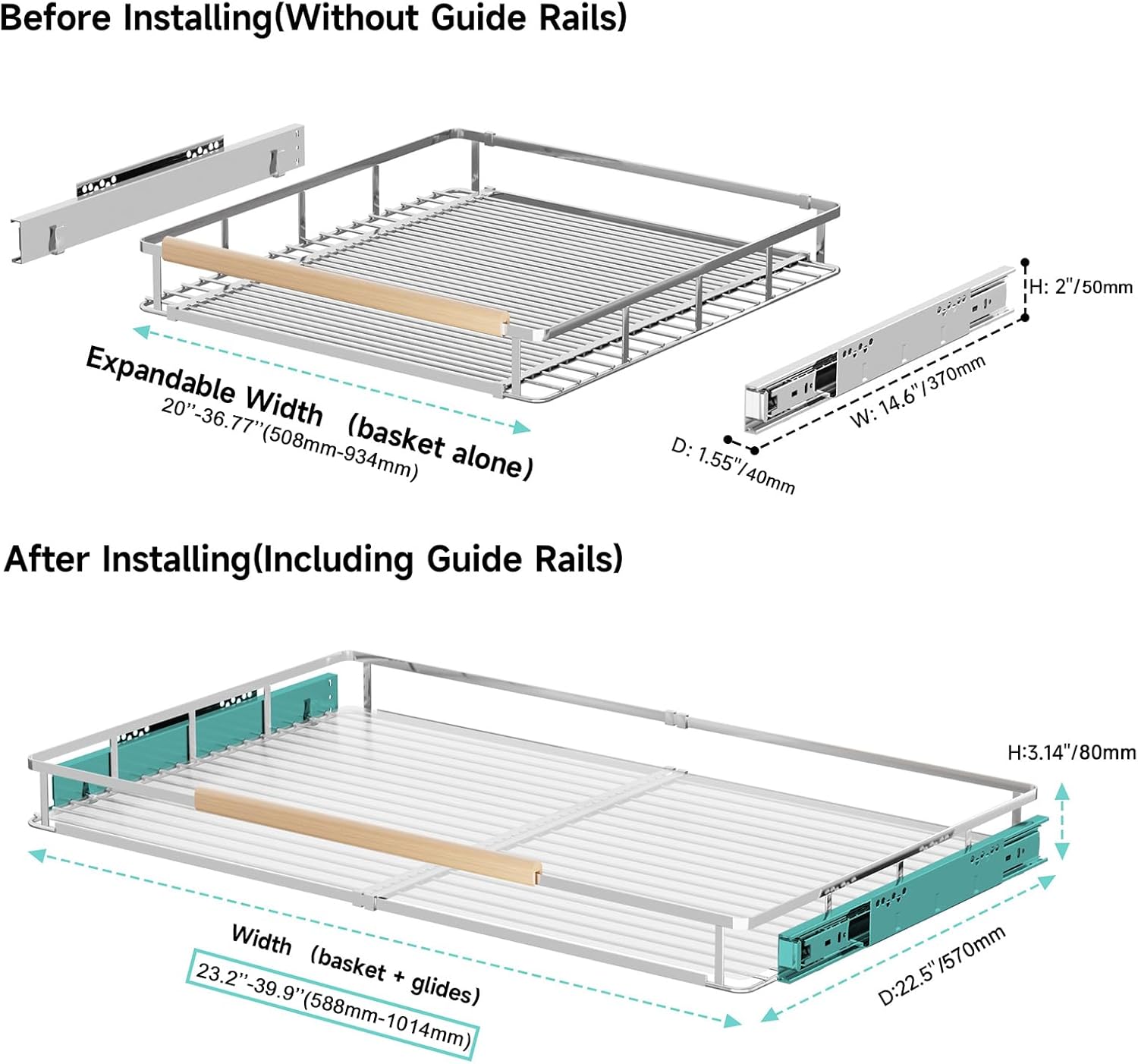 - Sturdy and Reliable Materials: Our pull out drawers for cabinets made of high quality chromed stainless steel, prevent scratches, not easy to rust and deform, and features excellent stability. Smooth surface and chrome color can be matched with various style of cabinets, suitable for variety of family styles.