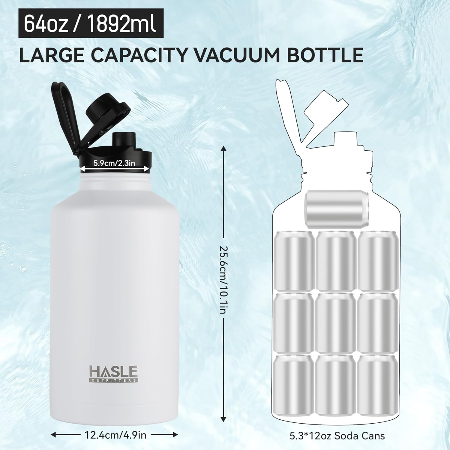 HASLE OUTFITTERS Half Gallon Insulated Water Bottles 64 oz, Stainless Steel Metal Water Jug with 2 Lids Keep Cold 48h/Hot 24h, Leak Proof & BPA-Free Water Flask Jug(White,1)