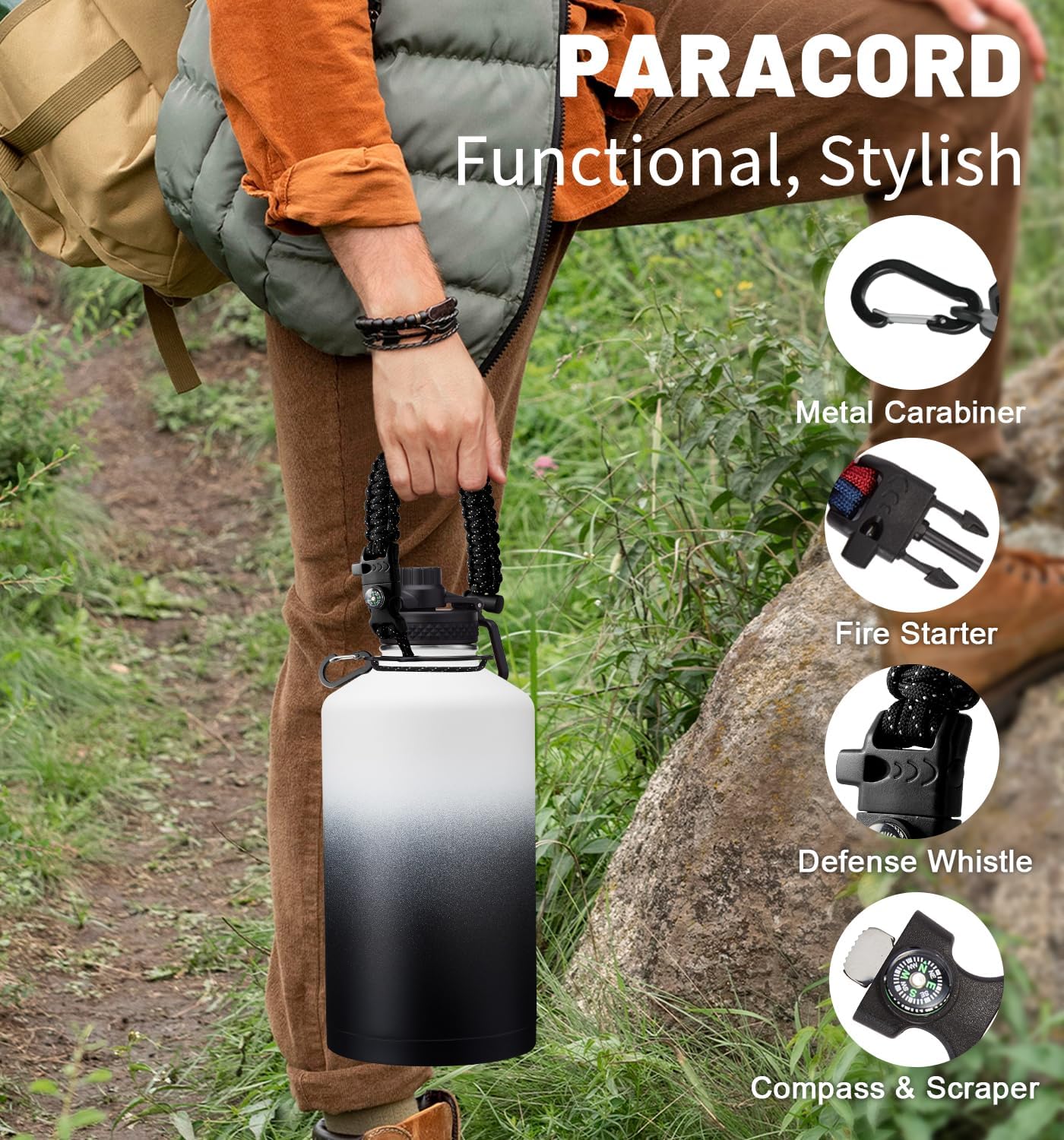 - UNIQUE DESIGNS PARACORD HANDLE: Full-function paracord handle made in individual styles to match the color of the flask water bottles. With compass, safety ring, carabiner, flint fire starter & whistle. It unravels into a sturdy and taut rope in an emergency, making the large water jug an ideal survival kit for expeditions in the wild