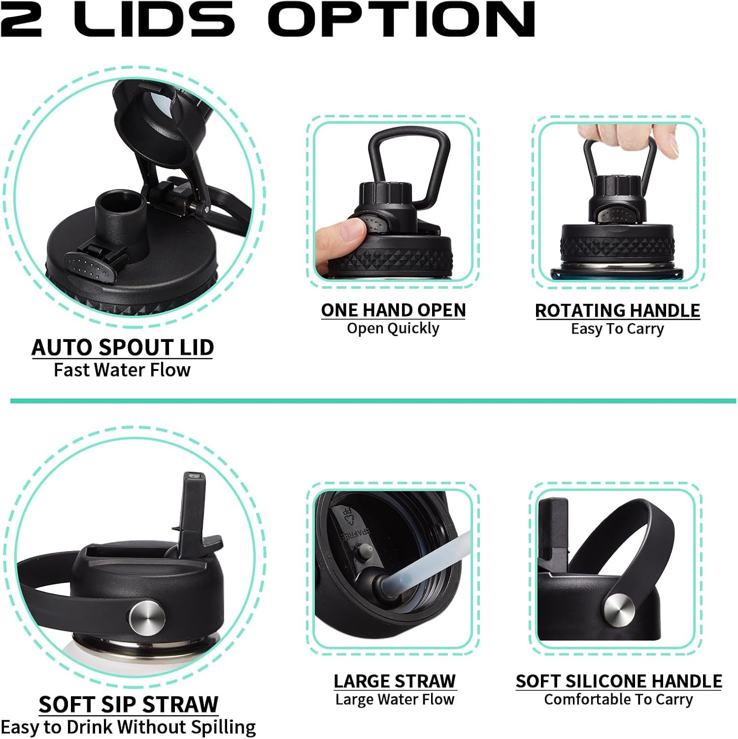 - 2 LID OPTIONS (Auto-spout & Straw): two different lids are complete LEAK PROOF & design for easy drink. The pops-up lid for easy drinking and seals shut for no leaks when you're on the go. The straw lid makes it easy to enjoy spill-proof sips, and package come with a alternative straw & a straw brush for easy cleaning