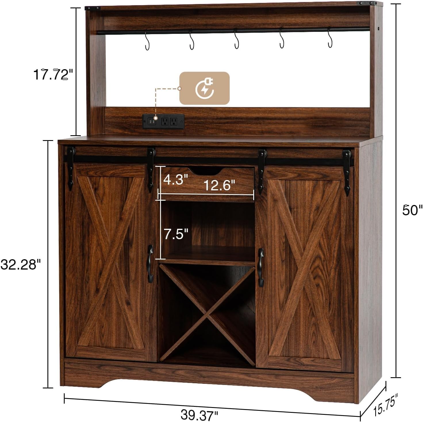 Wnutrees Farmhouse Coffee Bar Cabinet with Charging Station and USB Ports, Sliding Barn Door, 39" Kitchen Hutch Sideboard Buffet Storage Cabinet, Fits Kitchen Dining Living Room, Brown