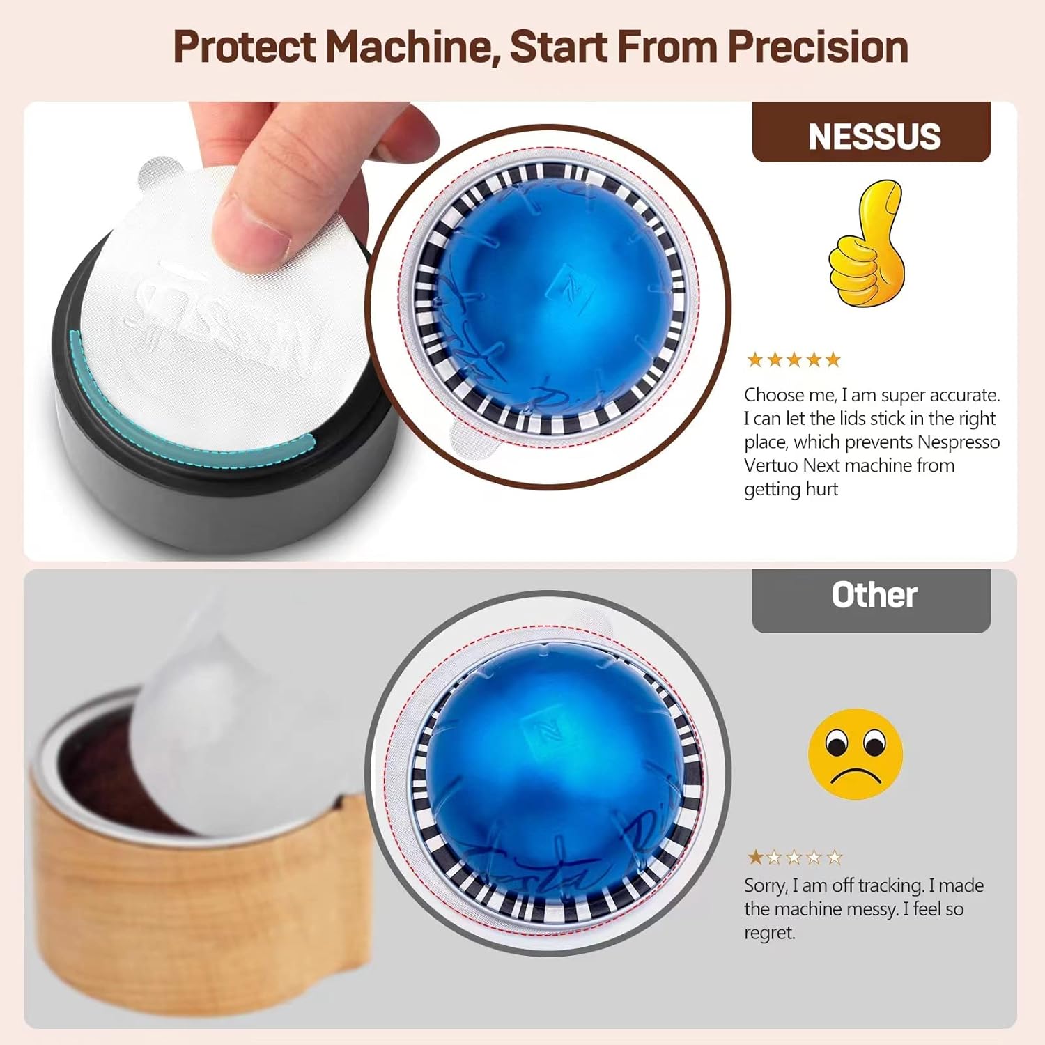 - Perfect Size & Adhesion: Say goodbye to foil waste, weak coffee, and machine damage caused by ill-fitting seals. Nessus foil lids easily position reusable vertuo pods without covering the barcode. Plus, they feature food-grade adhesion that keeps your pods airtight and well-sealed, so you can pre-fill them and enjoy fresh coffee anytime.
