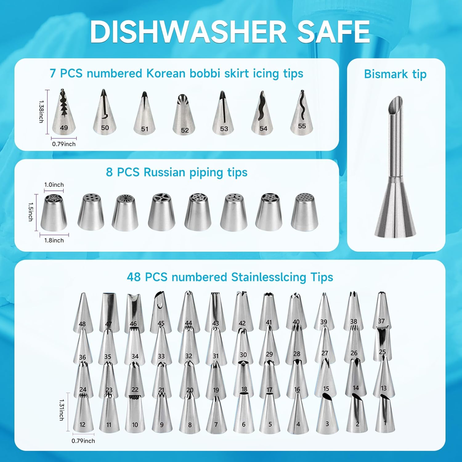 - CAKE DECORATING ACCESSORIES :Whether it is lettering or frosting swirls when you are decorating cupcakes, pies, desserts & pastries; these fondant tools lets you decorate your tasty treats with ease,NUMBERED TIPS: We have selected top 63 tips including Round Tips, Leaf Tips, Petal Tips, French Tips, Basket Weave tips, open Star Tips close Star Tips, Drop Flower tips, use carefully selected stainless steel of 304 grade, Stainless steel tips with a handy re-usable storage case
