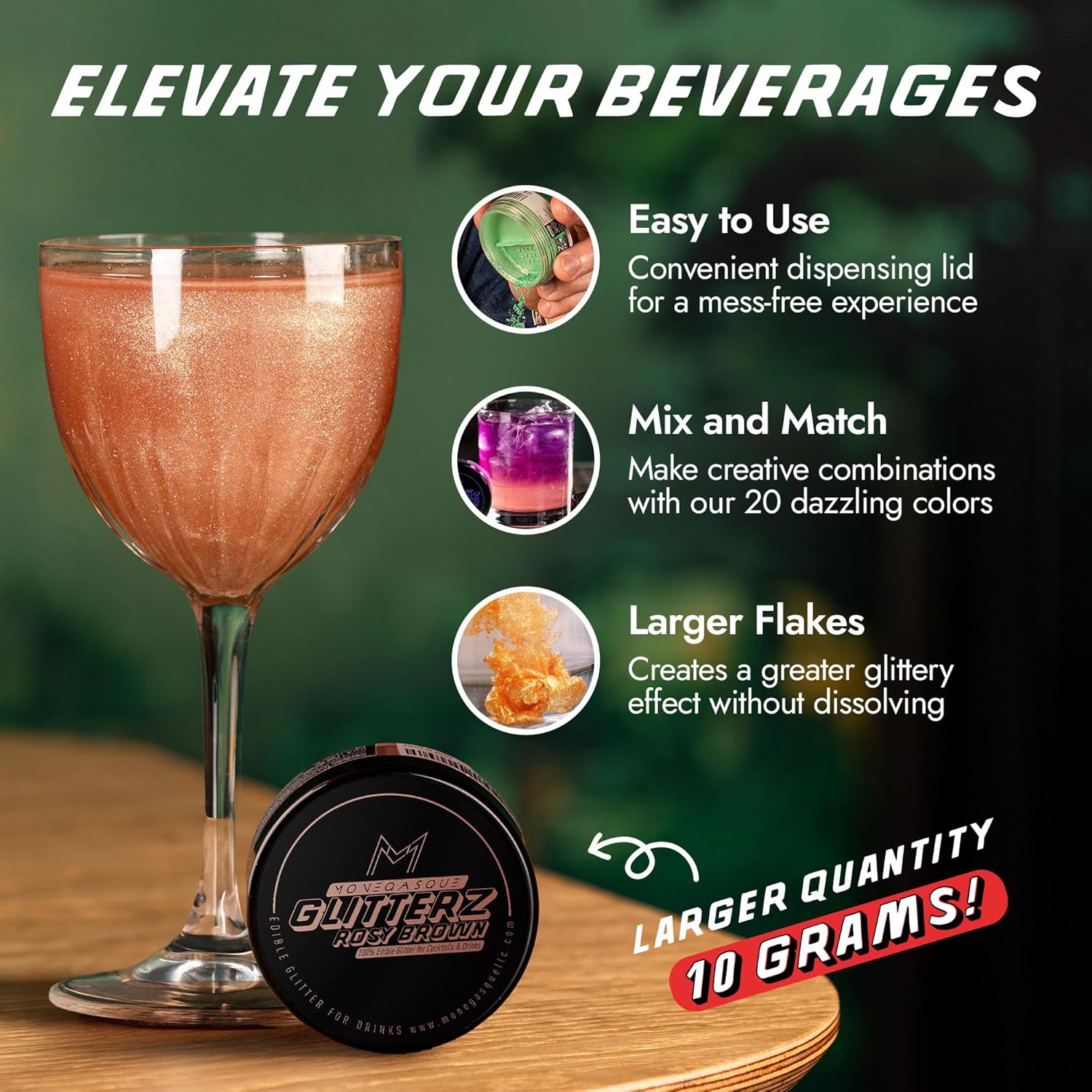 - PREMIUM EDIBLE GLITTER FOR COCKTAILS – Add a touch of glamour to your creations with MONÉGASQUE Glitterz. Perfect for cocktails, cakes, and more, our halloween glitter is flavorless and safe, crafted from mica-based pearlescent and food-grade colorants.