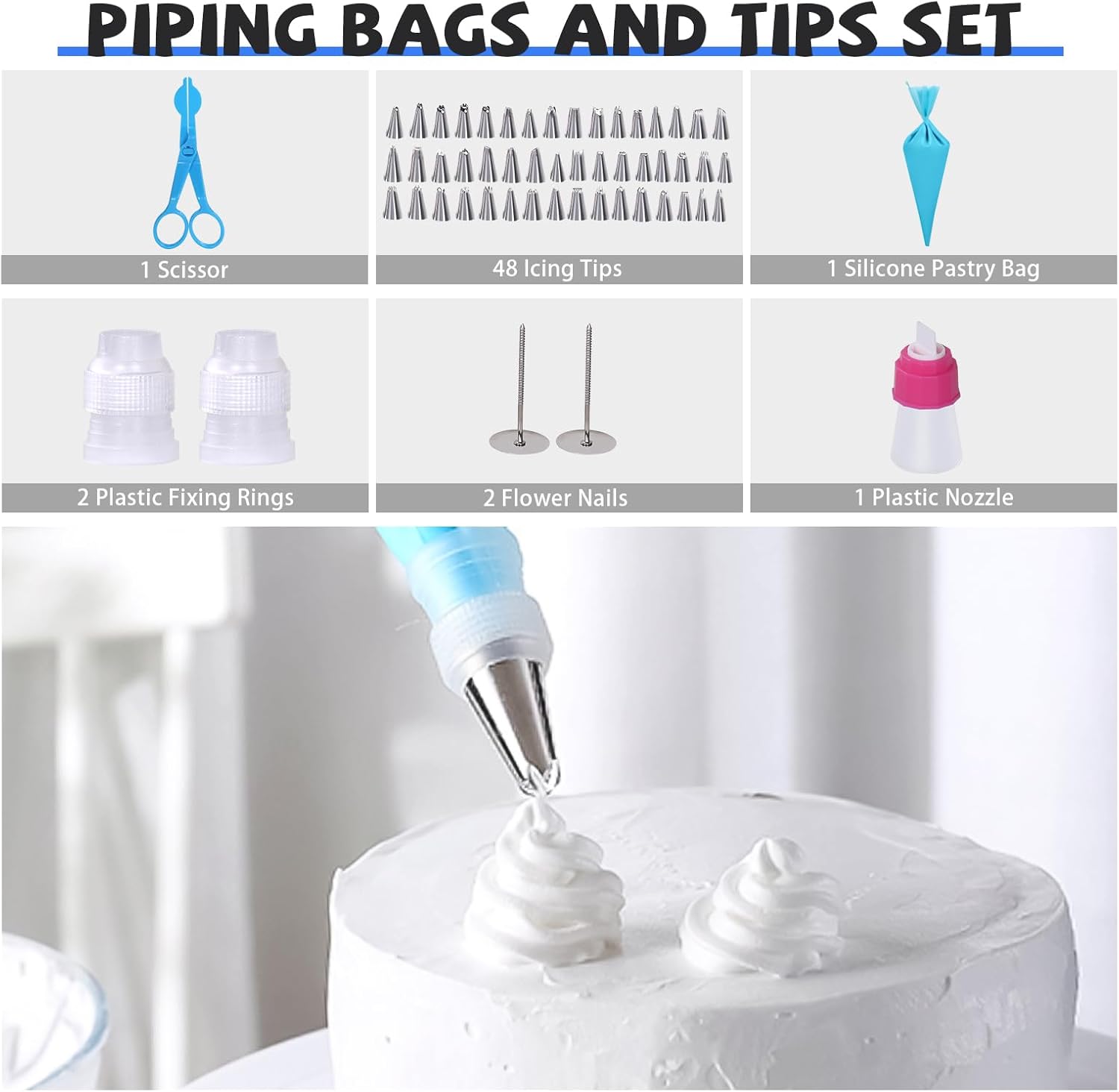 - 【Complete & Professional】 Cake decorating supplies kit include a variety of accessories needed for baking: 1x 11'' cake turntable stand for decorating, 48x Icing Tips, 1x scissor, 1x reusable piping bags, 2x piping nozzle adapter, 1x Straight & 1x Offset Spatula, 3x icing smoother, 2x flower nails, 1xPlastic Nozzle. The included 60-piece cake tool set is a popular choice for baking novices and professionals alike.
