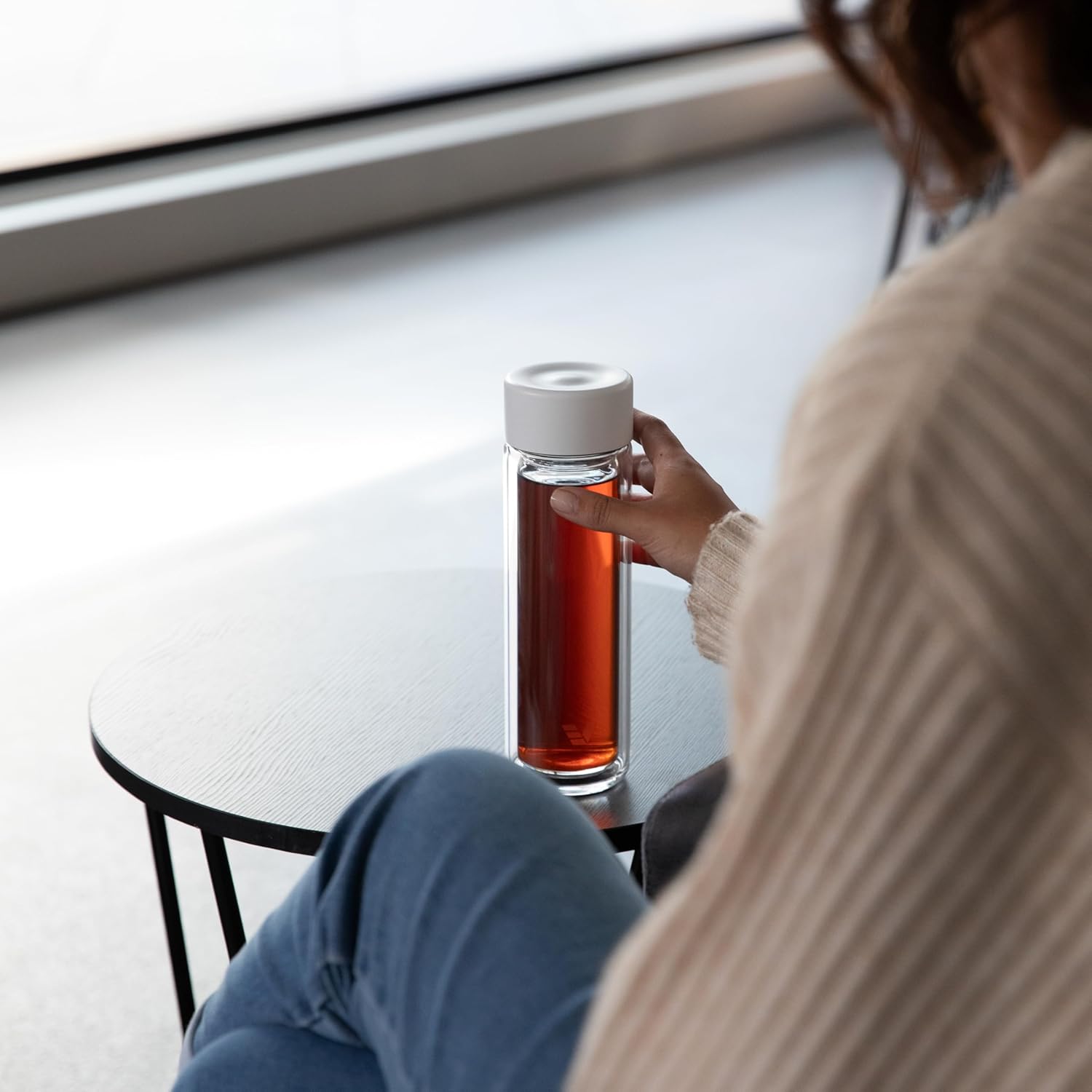 Glass Multi Tea Infuser Bottle 14oz - Double Wall Borosilicate Glass Flask | No Plastic Touches Contents | Perfect for Office or Home - White