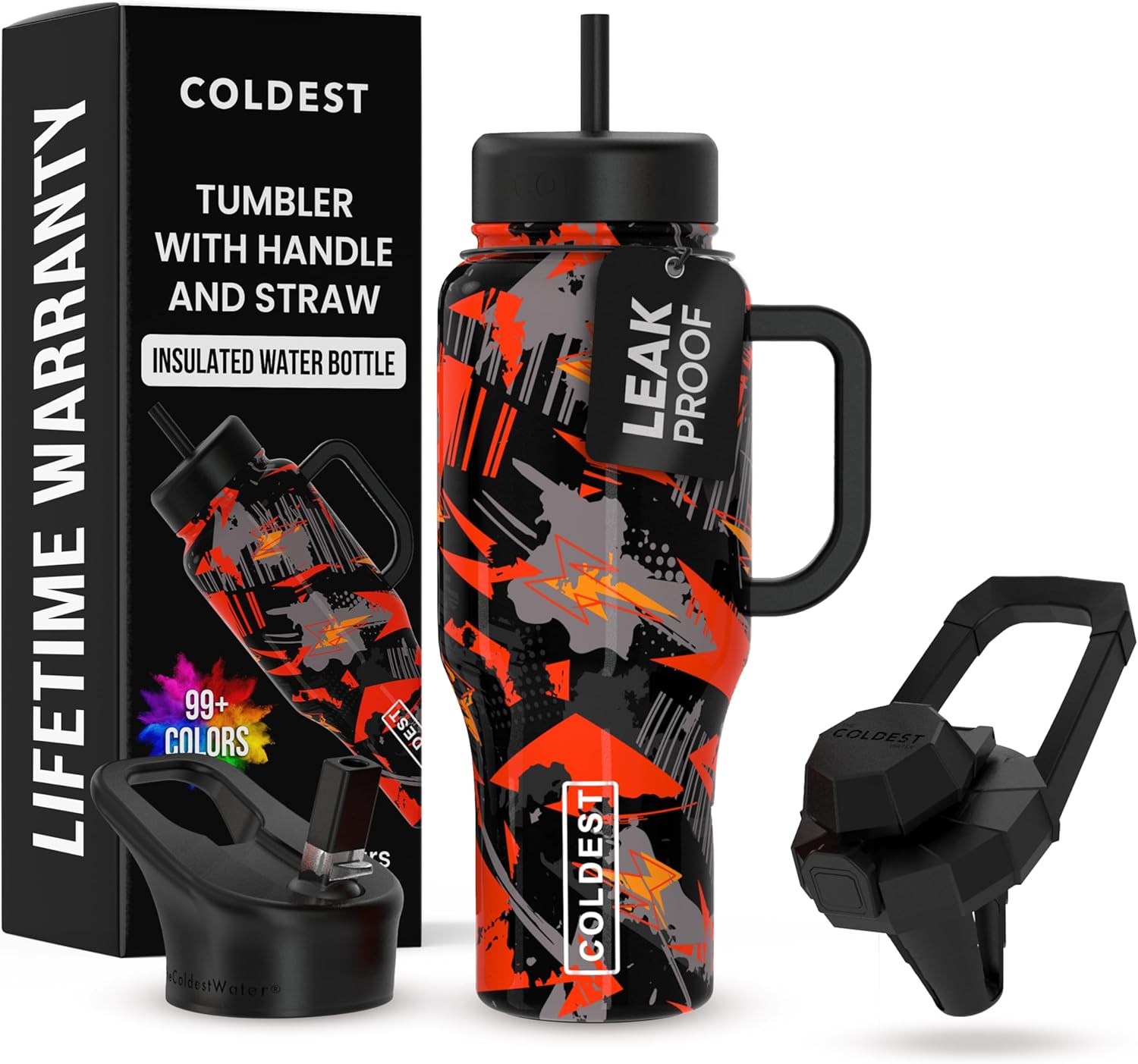 - 100% Leak-Proof, Guaranteed: No more worrying about spills- Coldest water bottle with handle is engineered for a completely leak-resistant experience. With three versatile lids, including a straw option, you can confidently take your drink anywhere without a single drop escaping.