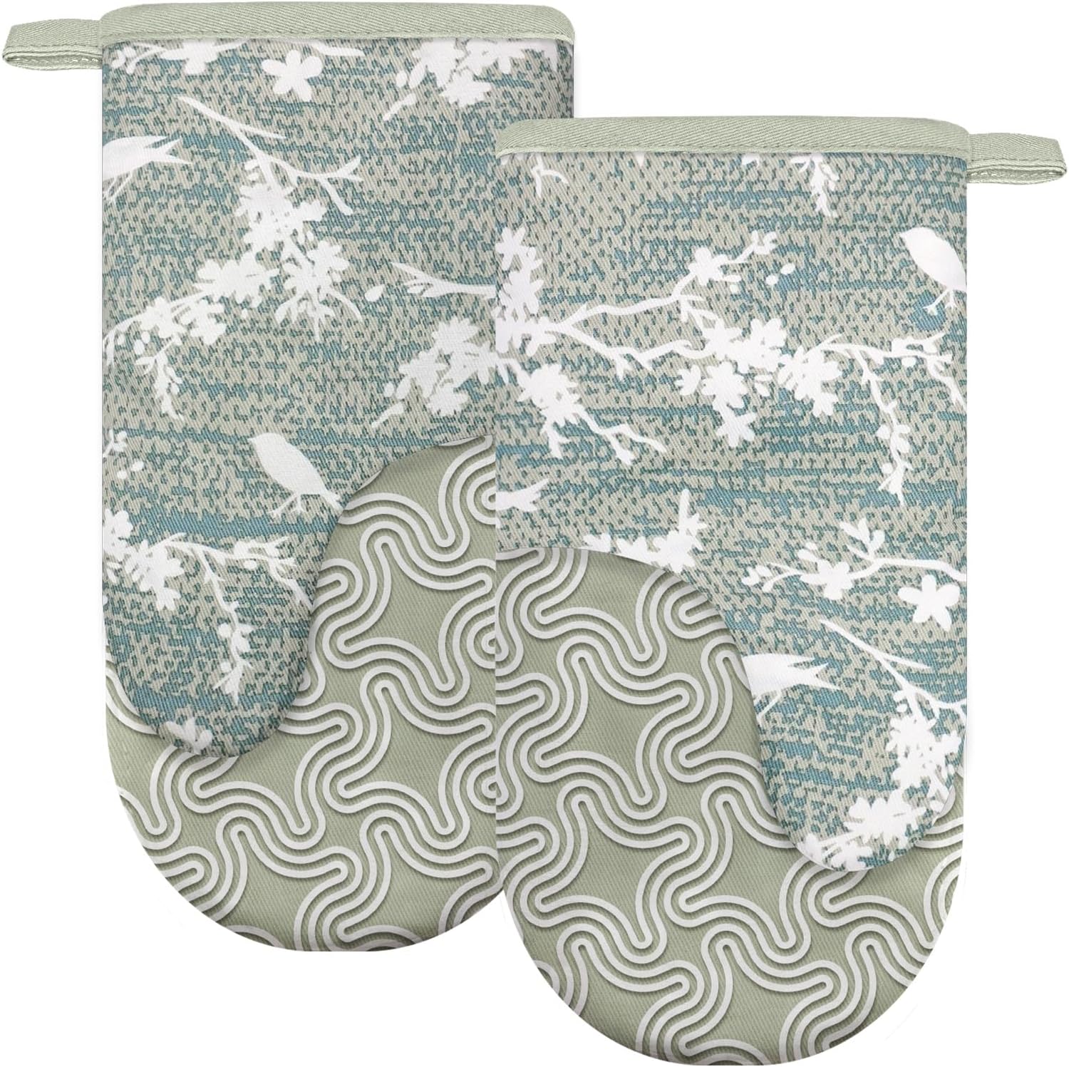 Thumb Oven Mitts, Heat and Slip Resistant Silicone Kitchen Mittens 2-Pack Set, Aqua Birds Soft Long Oven Gloves, Flexible Thick Potholders for Safe Baking Cooking and Grilling (Aqua)
