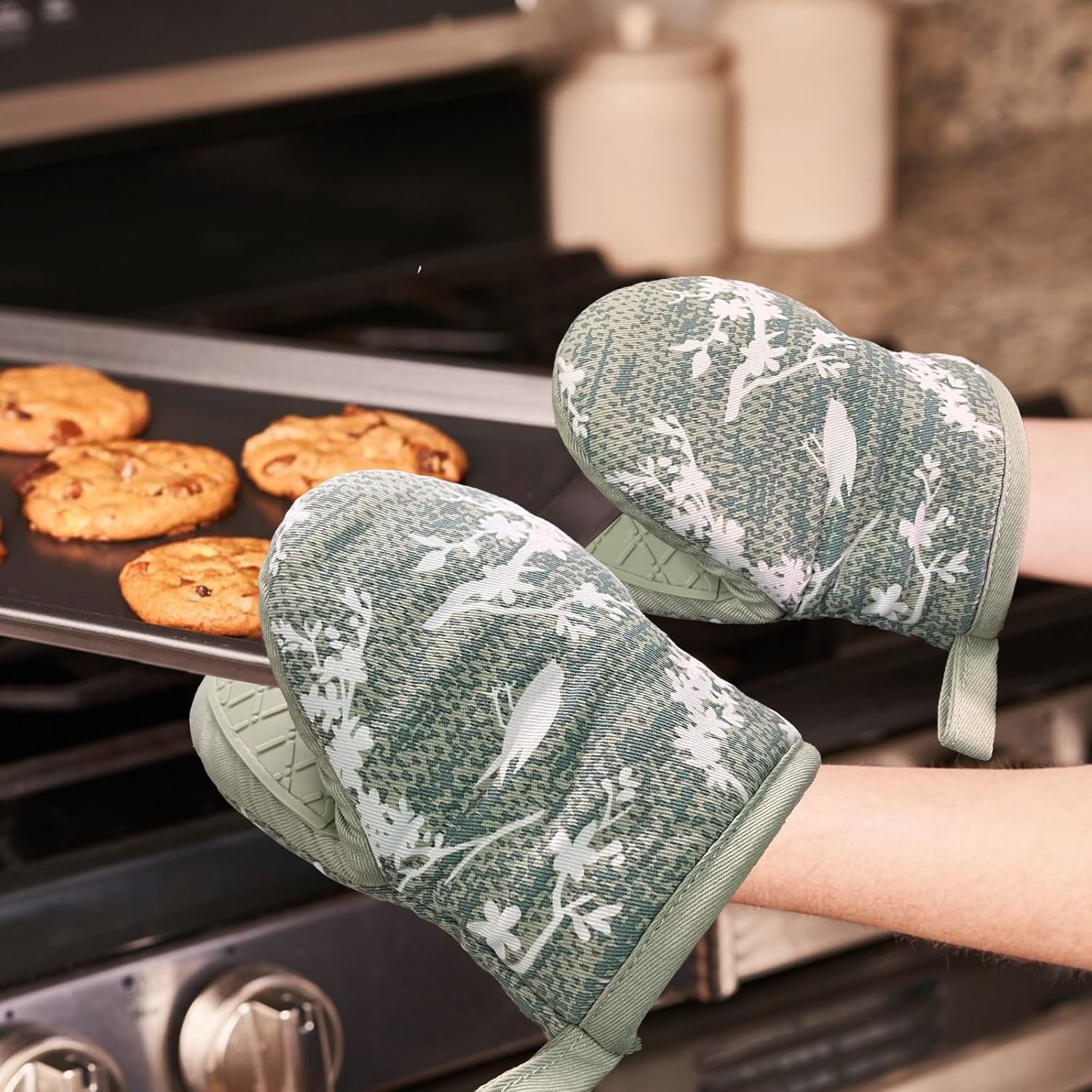 - 3. CUTE & FUNCTIONAL: The oven mitts with fashion patten is cute and add some fun to our kitchen decor. hanging loop, features a convenient for displaying or storing, save your room and make your kitchen look more cleaner.