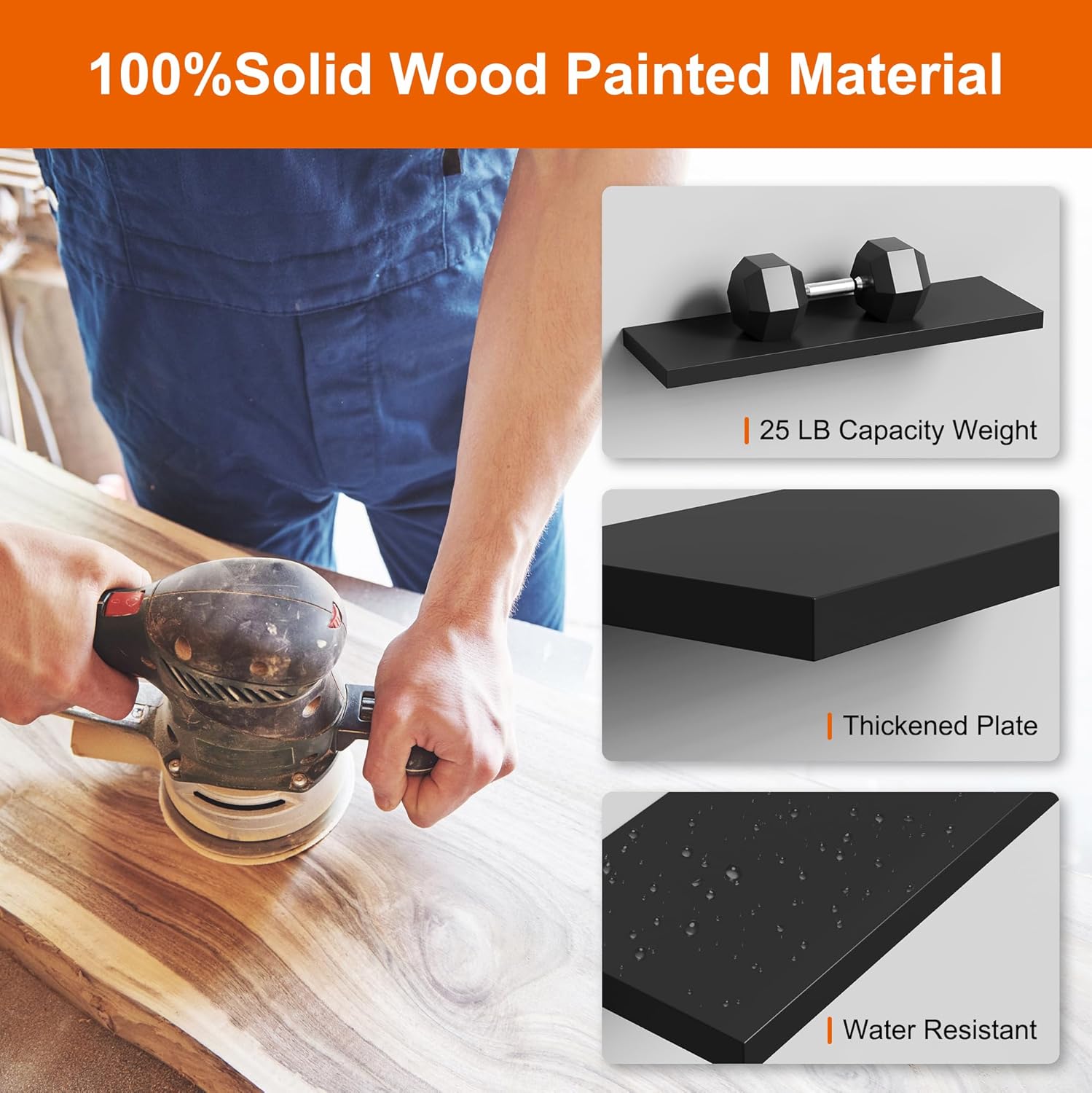 - 【Modern Concise Design】Our black floating shelves are designed with modern simplicity. It has streamlined look to bring modern style and vintage atmosphere to the home. Our wood floating shelves for wall is a set of 2 wall mounted shelves. Our rustic wood shelves can give us plenty of space for creativity, we can choose a line, a ladder shape, or a symmetric way. Let our floating shelf wood more suitable to the home decor and bring a better visual experience.