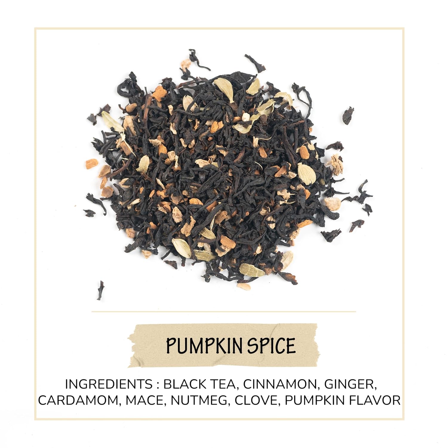 - PUMPKIN SPICE TEA - This seasonal take on black tea is made with premium black tea and spices. Each cup of our holiday brew is filled with a rich inviting aroma that entices the senses.