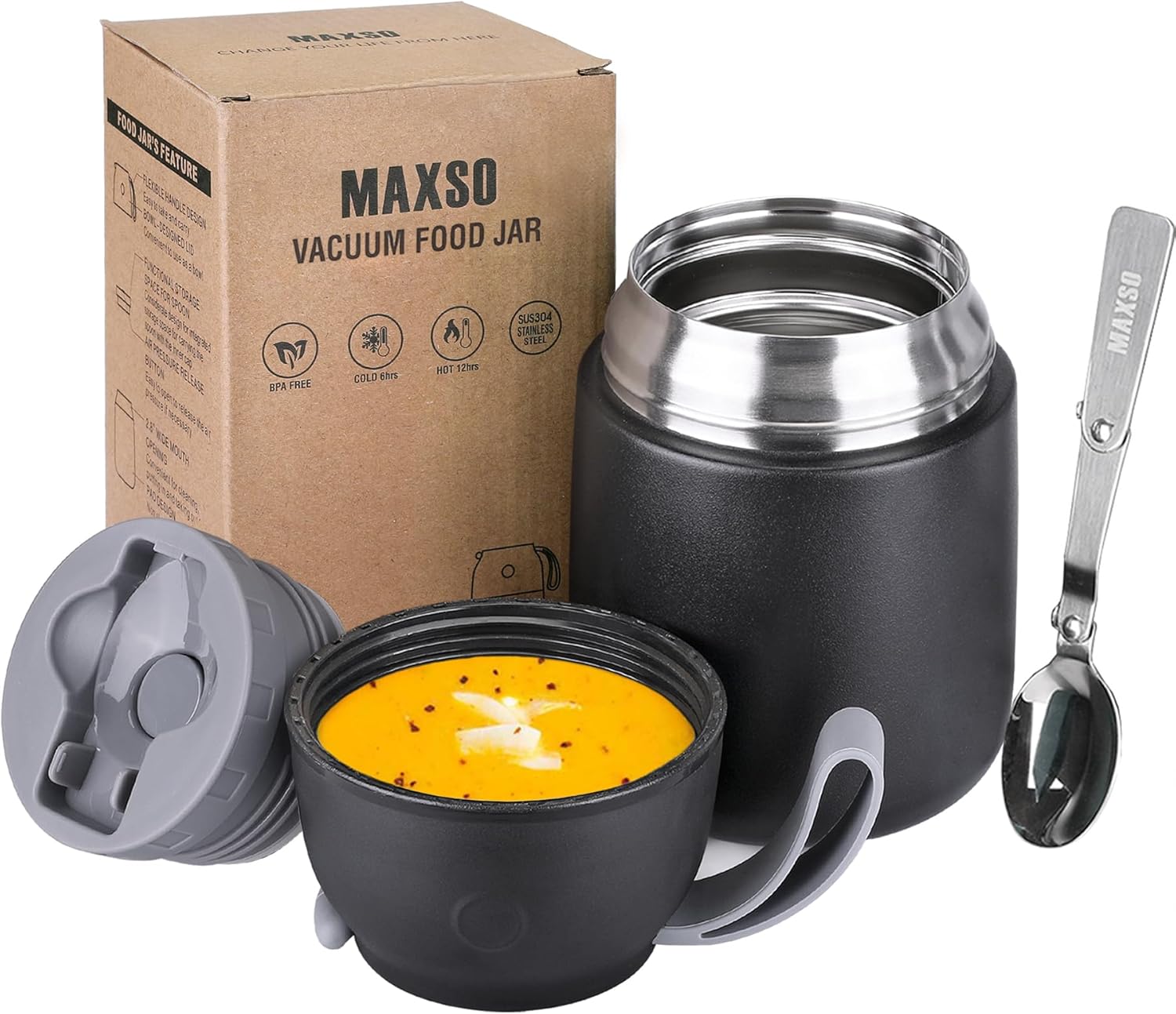 - 【Attractive & Practical Vacuum Food Container】It takes top marks for its superior insulation, 304 stainless steel material, BPA free, no PVC, 17oz capacitie and a versatile design that works for toddlers, kids and adults. This Insulated food container with foldable spoon on the lids for occasionally forgetting to bring tableware and not being able to eat delectable.