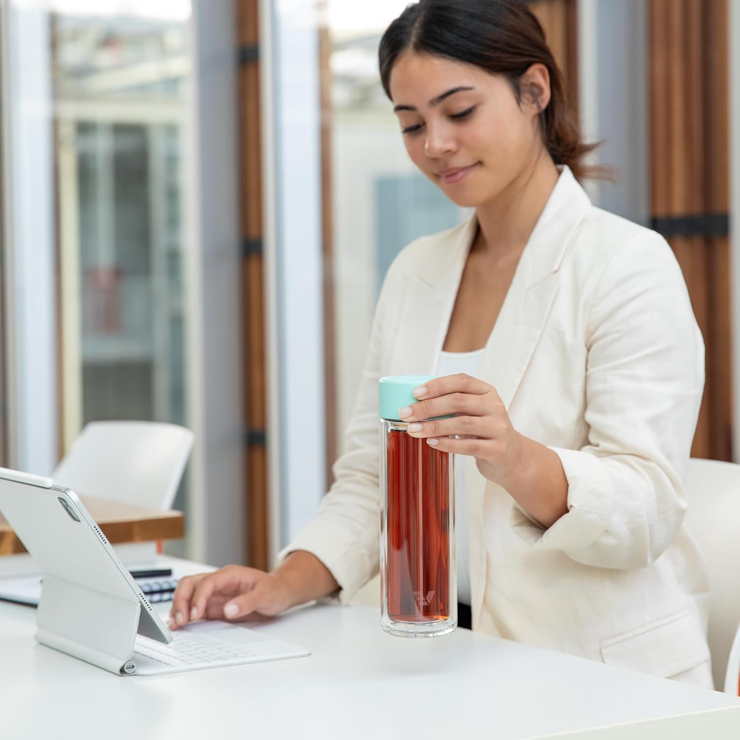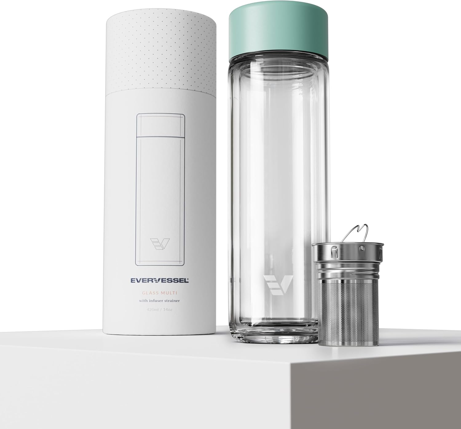 Glass Multi Tea Infuser Bottle 14oz - Double Wall Borosilicate Glass Flask | No Plastic Touches Contents | Perfect for Office or Home - Light Green