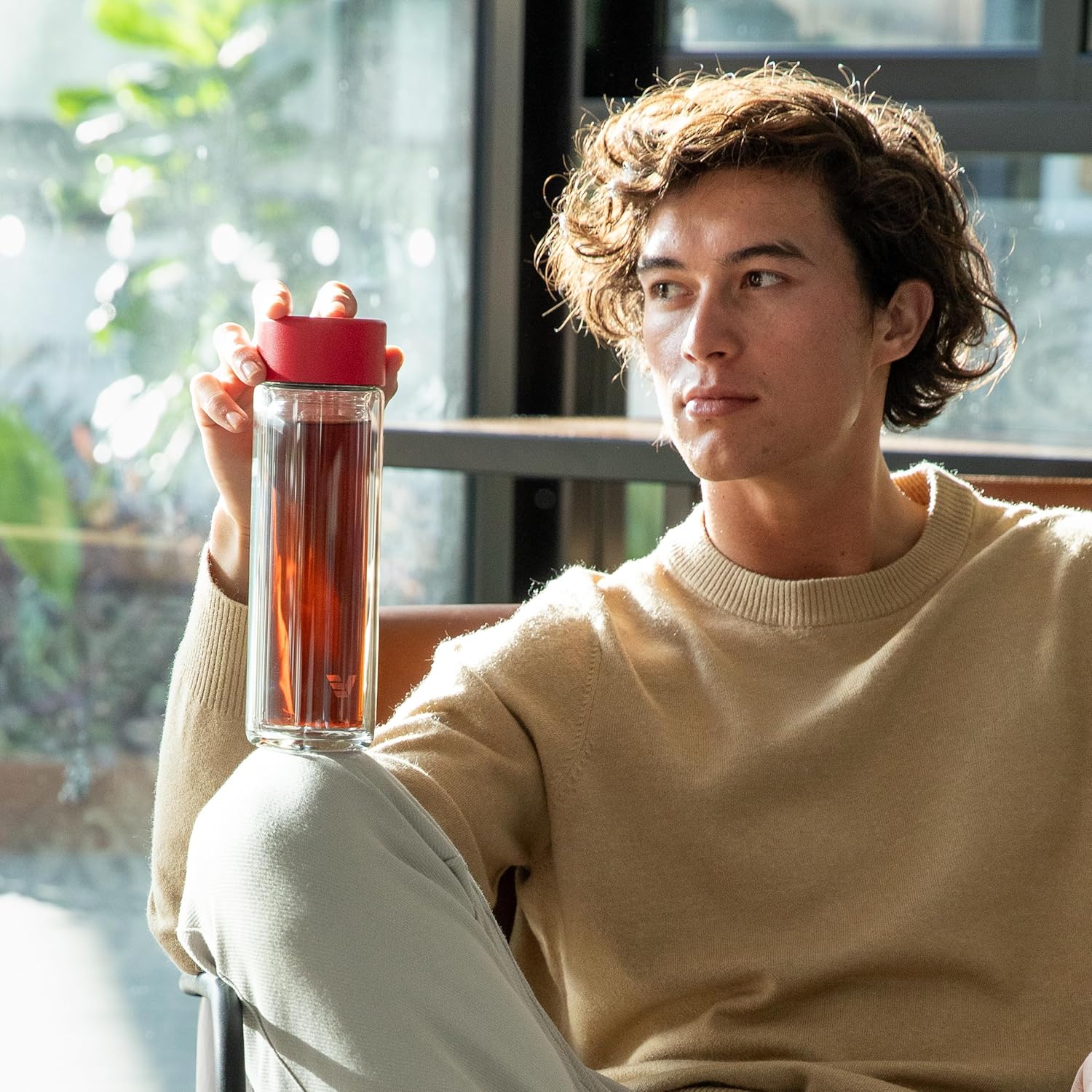 Glass Multi Tea Infuser Bottle 14oz - Double Wall Borosilicate Glass Flask | No Plastic Touches Contents | Perfect for Office or Home - Red