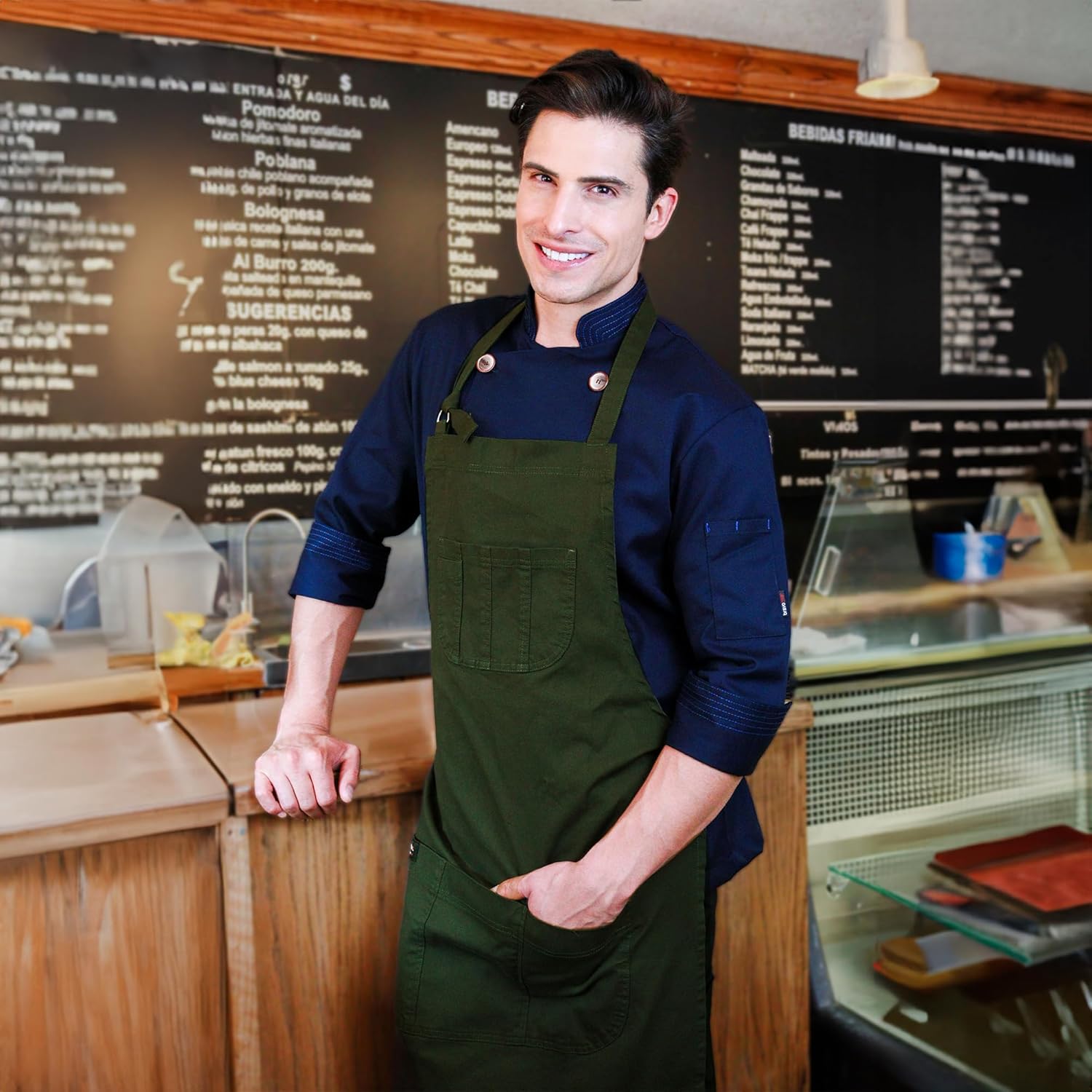 | Green Verona Gabardine Apron – Design for Men and women with neck adjuster, Anti-lint fabric with large pockets. For kitchen work, Chef.