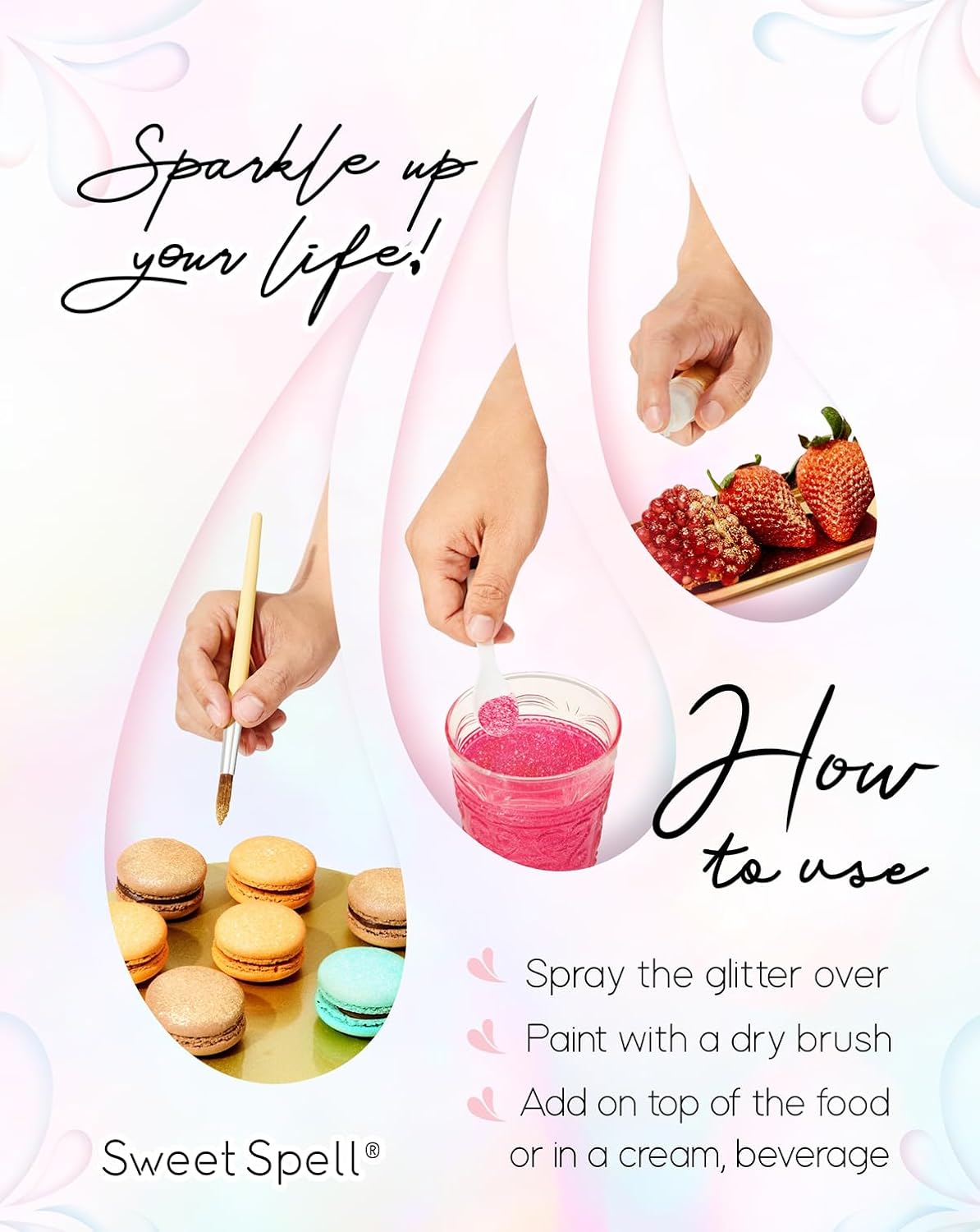 - Sparkling Drink Sensation: Elevate your drinks and cocktails with a mesmerizing glittery hurricane effect. Watch as your beverages shimmer and shine with our Sweet Spell drink glitter.