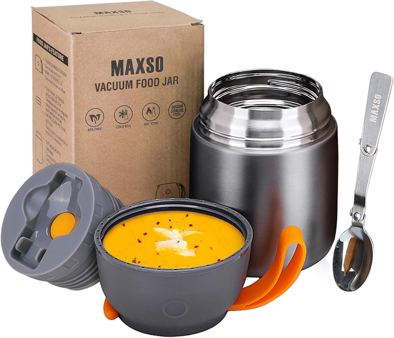 - 【Attractive & Practical Vacuum Food Container】It takes top marks for its superior insulation, 304 stainless steel material, BPA free, no PVC, 17oz capacitie and a versatile design that works for toddlers, kids and adults. This Insulated food container with foldable spoon on the lids for occasionally forgetting to bring tableware and not being able to eat delectable.