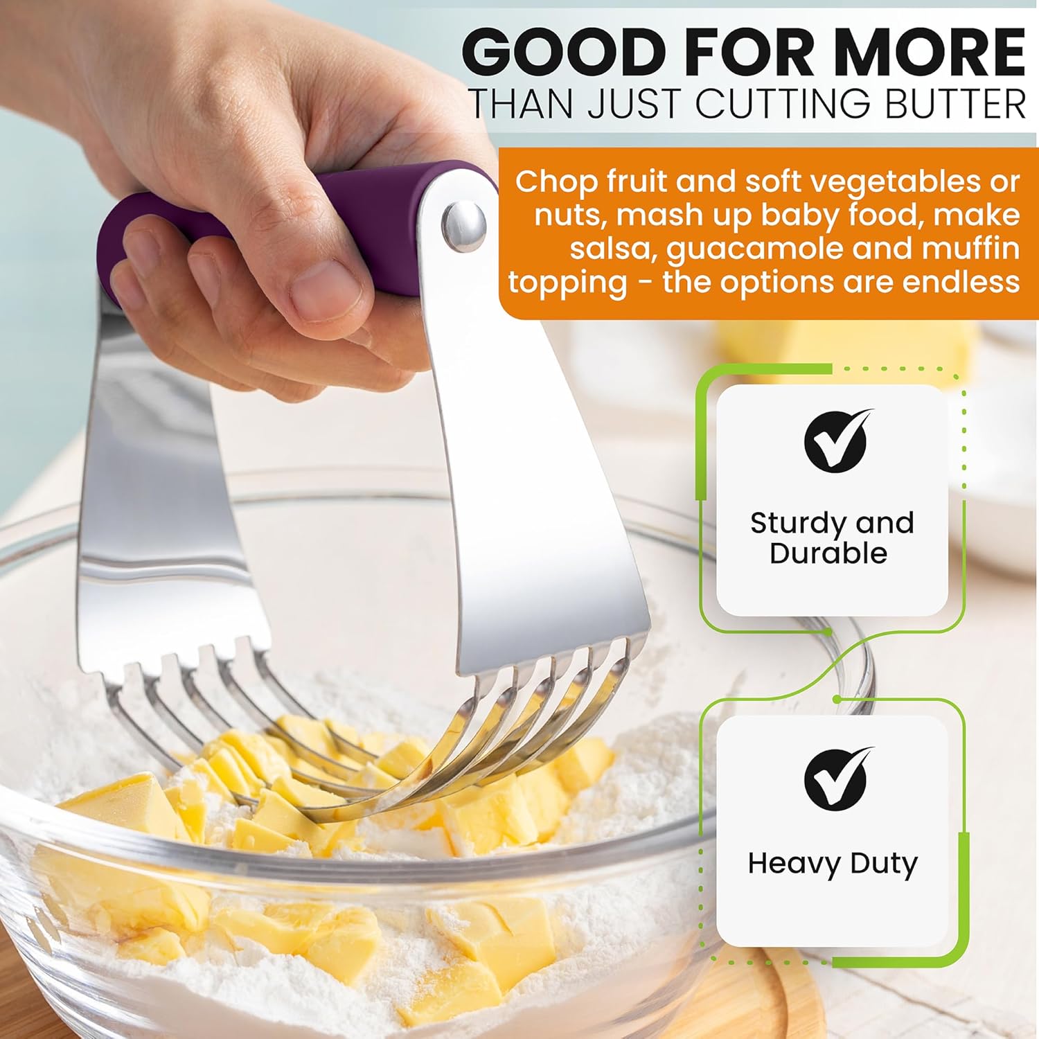 - Good For More Than Just Cutting Butter - Chop fruit and soft vegetables or nuts, mash up baby food, make salsa, guacamole, chopped eggs for egg salad, muffin topping and much more. It's also Dishwasher Safe.
