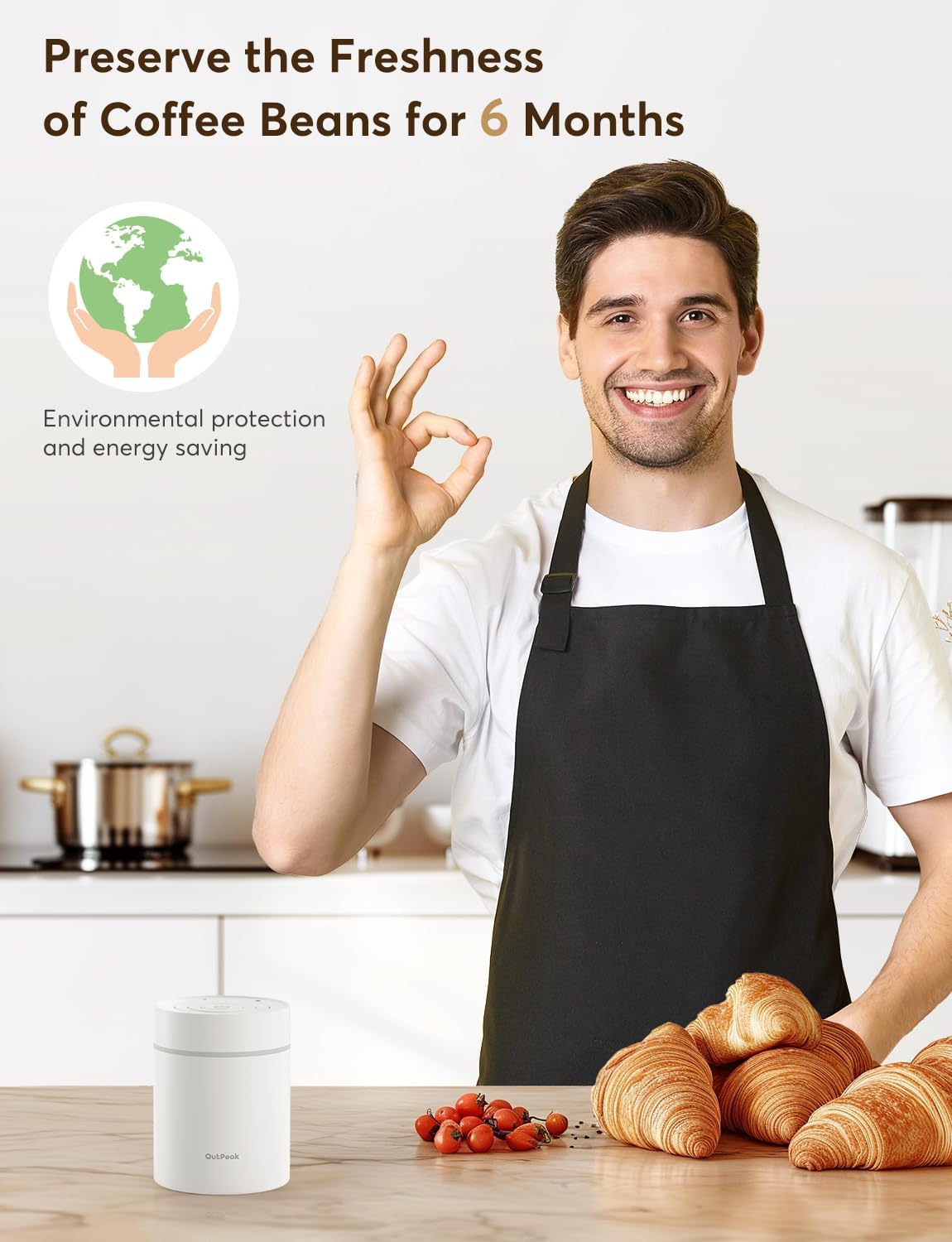 - Stay Sealed & Auto Vacuum: The OutPeak coffee container, with an automatic air sensor chip, maintains an auto-vacuum condition during sealing for energy efficiency. Operating for 3-6 months on a single charge, it cuts electricity costs while preserving the original oil and flavor of your coffee beans