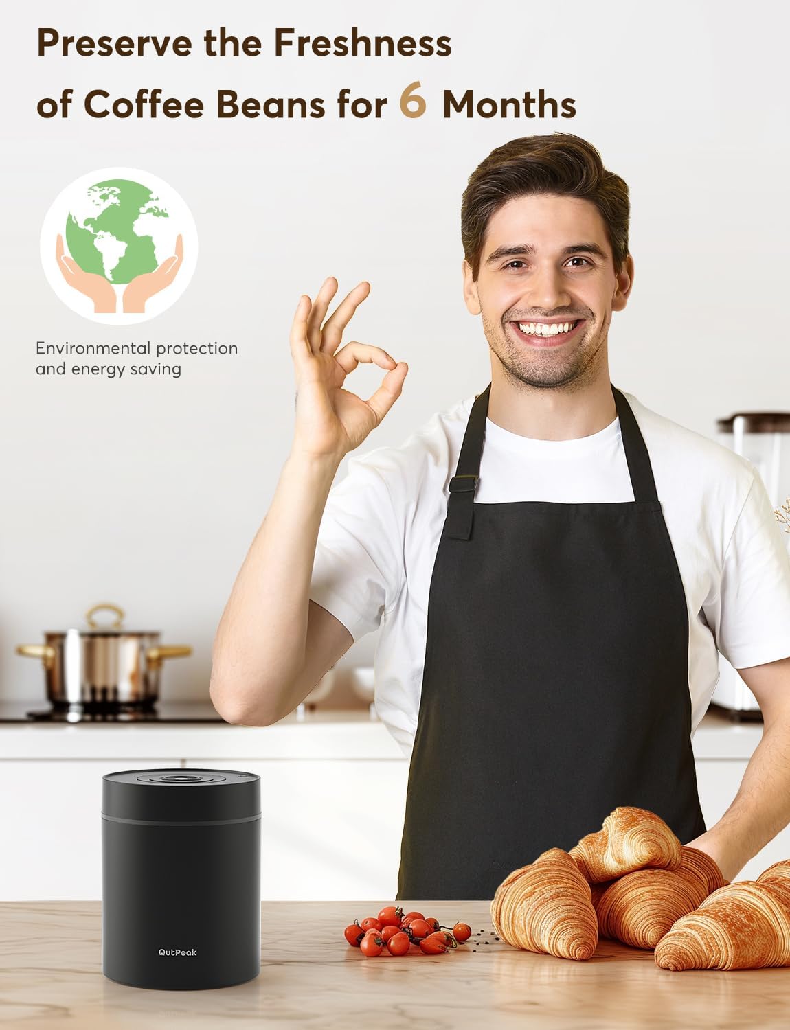 - Stay Sealed & Auto Vacuum: The OutPeak coffee container, with an automatic air sensor chip, maintains an auto-vacuum condition during sealing for energy efficiency. Operating for 3-6 months on a single charge, it cuts electricity costs while preserving the original oil and flavor of your coffee beans