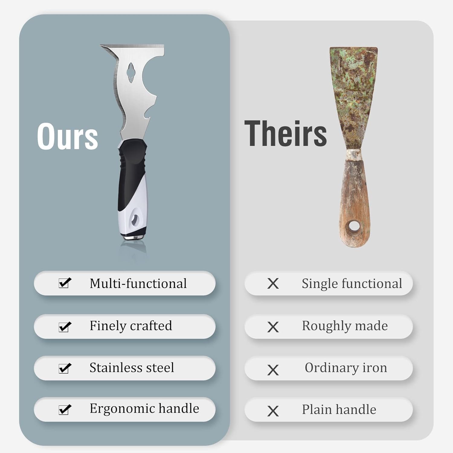 - Paint Scraper Materials: The polished rust proof stainless steel blade ensures higher efficiency and longer life