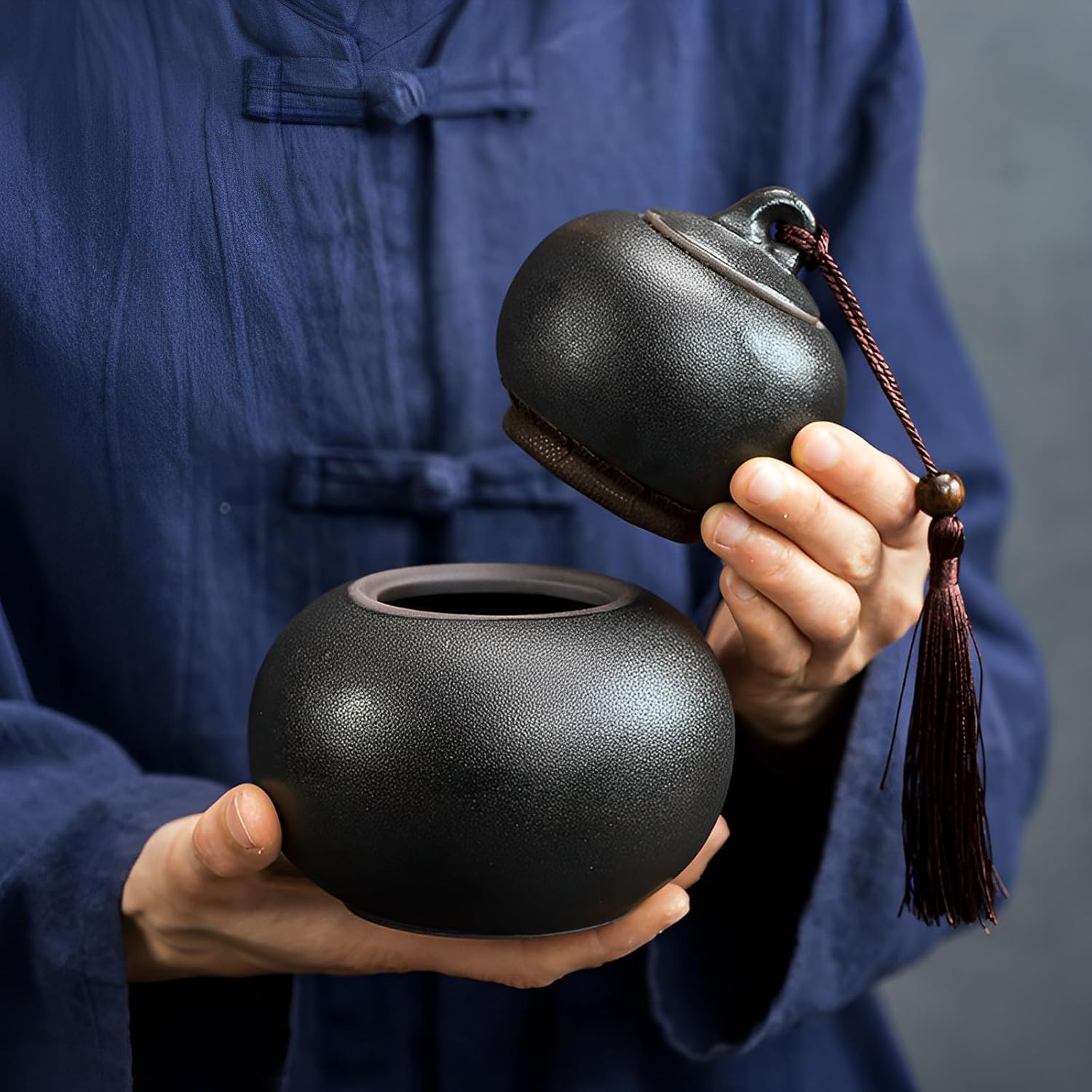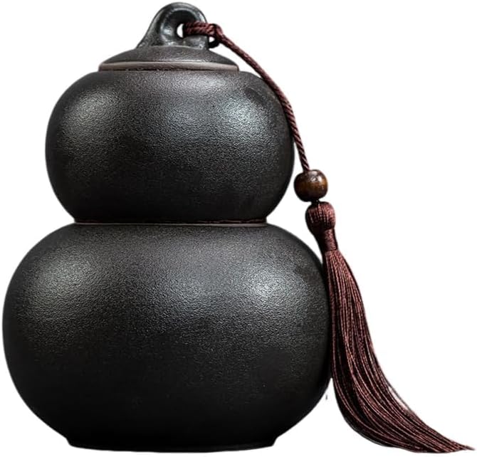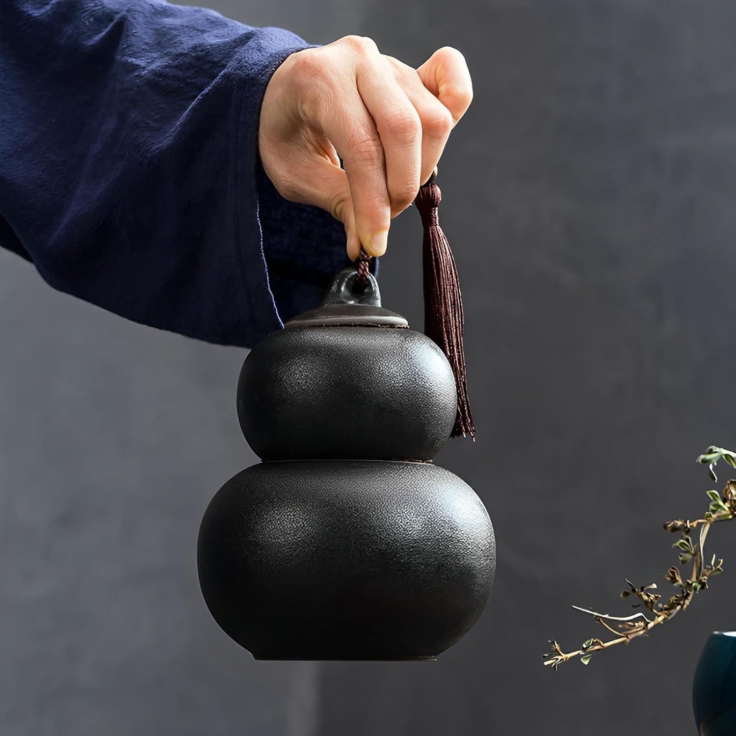 Ceramic Airtight Canister,22 Oz /660ml,Gourd Shap 2 Layers Tea Candy,Food Storage Jar for Coffee,Beans,Herb,Spices,Nuts -Stone Black
