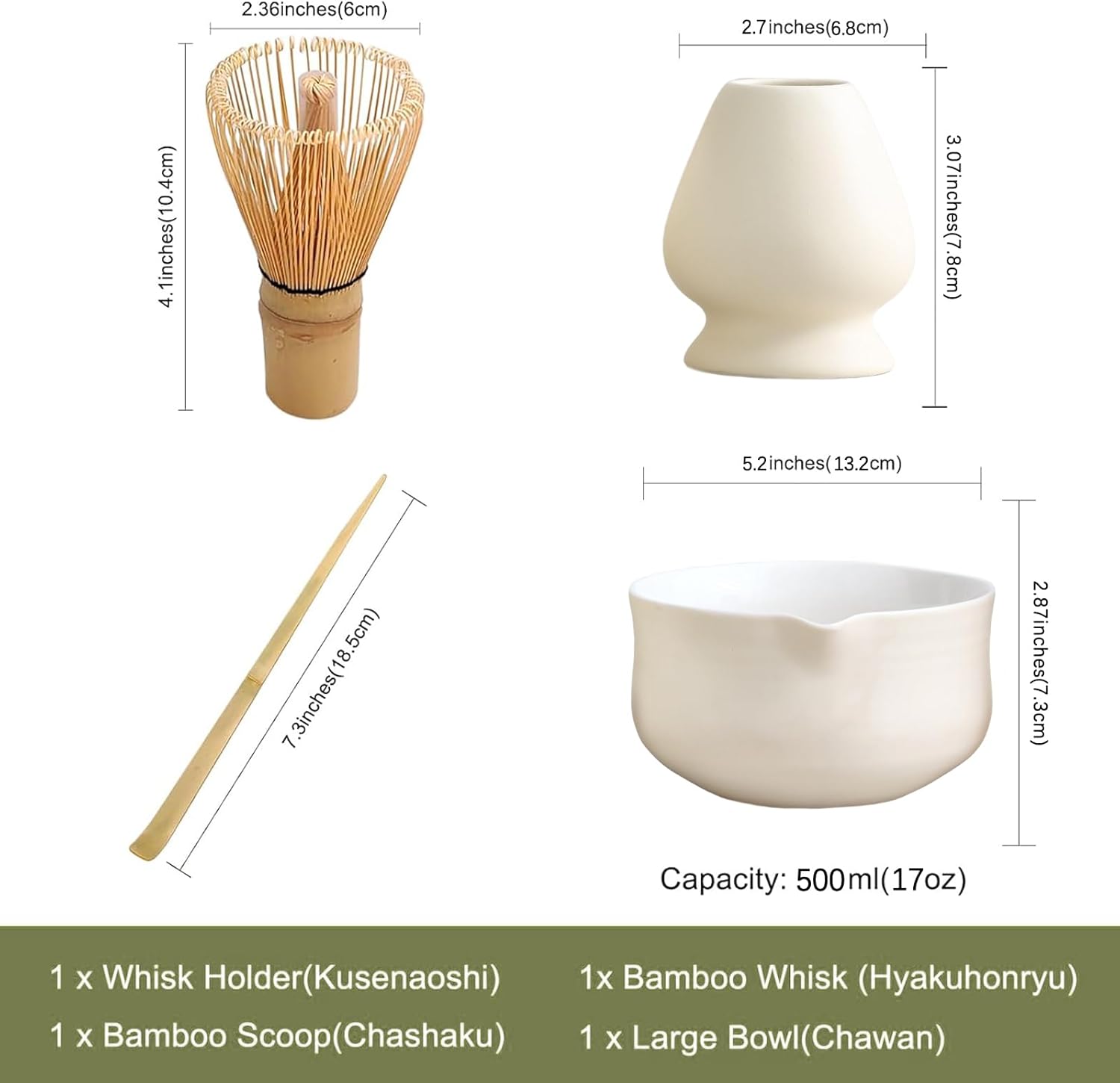 - [Exclusive Matcha Ceremony Collection]: Our 4-piece set includes essential tools for an authentic matcha experience: 1* Bamboo Whisk, 1* Bamboo Scoop, 1* Ceramic Bowl (Chawan) 500 ml/17 oz, and 1* Ceramic Whisk Holder. Crafted with precision, this ceramic matcha set is designed to make embracing matcha as a lifestyle effortlessly stylish. Elevate your tea ritual with our thoughtfully curated collection, perfect for both enthusiasts and newcomers to the world of matcha.